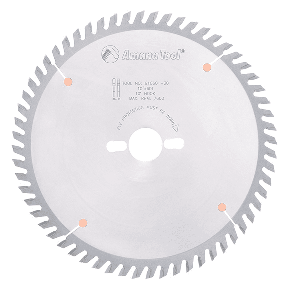 While this blade handles general trimming and crosscutting of hardwood and softwood, plywood and composition materials, it excels at cutting single or double-sided plastic-laminated material. It leaves a smooth, clean, chip-free finish on the top and bottom edges. The blades in this series feature a high tooth count, the triple-chip grind and a 10? hook angle for a successful compromise between feed effort and cut finish.