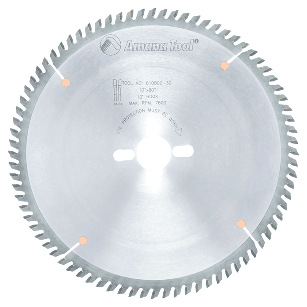 Our trim blade, suitable for use on table saws, sliding table saws, radial arms, and miter saws of all types, leaves a super-smooth finish when cutting hard or softwood. It is especially suited to trimming and sizing veneers and laminates, in single sheets or in stacks. The alternate top bevel grind and high tooth counts produce excellent, chip-free cuts. The 10? hook angle provides effortless feeding.