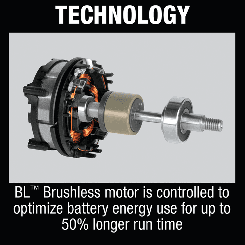 Efficient brushless motor is electronically controlled to optimize battery energy use for up to 50% longer run time per charge