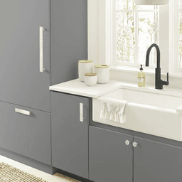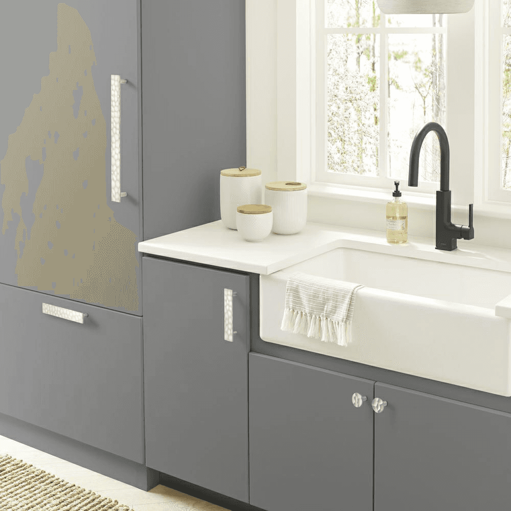 The Amerock 1-3/16" Kamari mushroom knob is finished in Gunmetal. Drawing inspiration from the sand patterns found on exotic volcanic beaches, the Kamari collection features a scalloped surface that adds a high-end designer look to any cabinet or drawer.