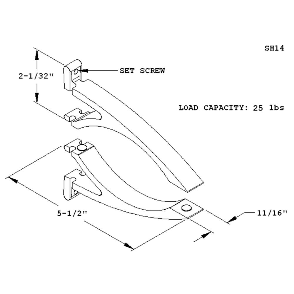 SH14 arch shelf bracket is satin aluminum finish and stands out 5-1/2" from track and is suitable for shelves up to 12" deep. One bracket goes in facing up, its set screw tightened, the shelf goes on, the other bracket goes in facing down, and its set screw tightened.