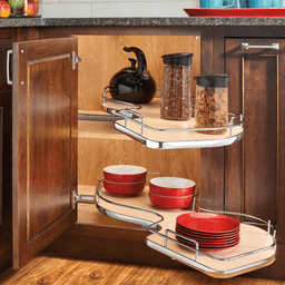 Blind corner cabinets don't have to be wasted space and lost items. Bring more functionality and accessibility to your cabinets with Rev-A-Shelf's Cloud. Designed to mount one tray to floor of cabinet and second tray as a floating shelf. No cabinet shelf needed to support second tray.\r