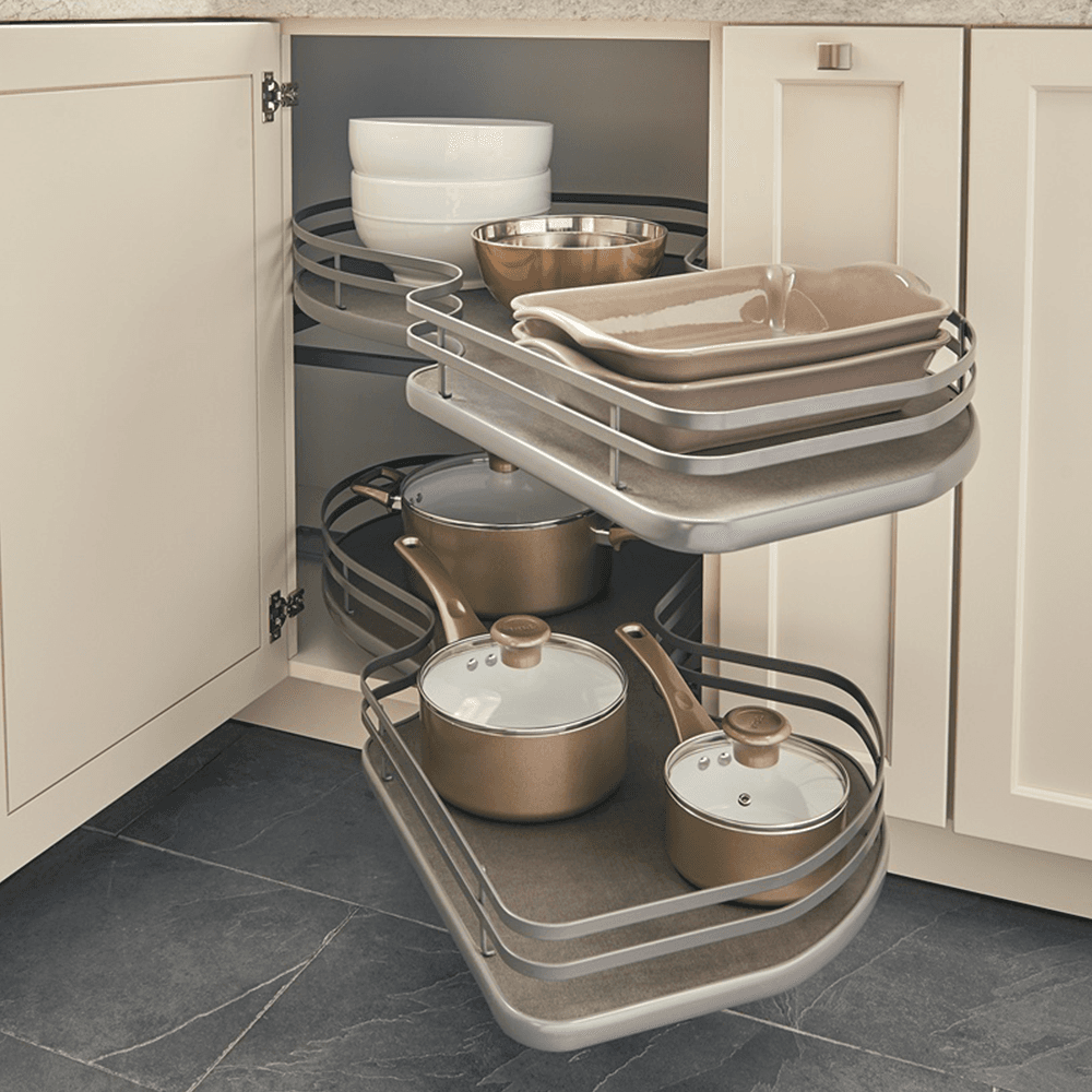 Reach for the stars and fulfill your storage needs with the Cloud Orion Gray Contemporary Organizer. Designed for full access (frameless) blind corner cabinets with 15", 18" or 21" openings, the new Cloud with orion gray flat wire and solid bottom shelves with a textured linen finish complement contemporary kitchen and adds updates style to traditional and transitional designs. Available in two-tier left or right-hand door options, the Cloud fits into nearly all blind corner applications and is available with or without soft-close (sold separately).\r