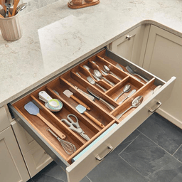 Organize kitchen drawers with Rev-A-Shelf's Wood Cutlery Tray Insert. The WCT-WN Series is made of Walnut with uv cured satin finish. This modern day clutter solution requires a simple drop-in installation with two sizes that may be trimmed to fit various drawer sizes.