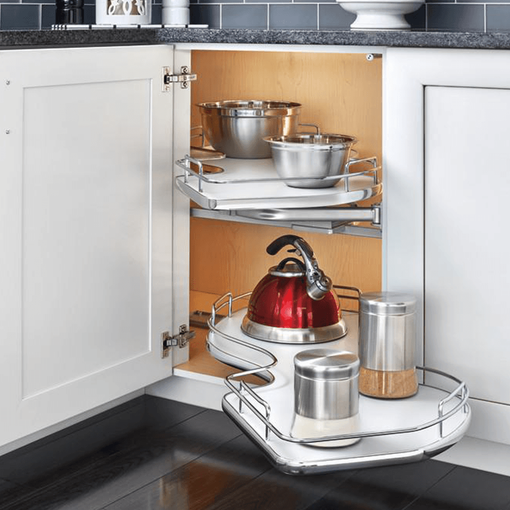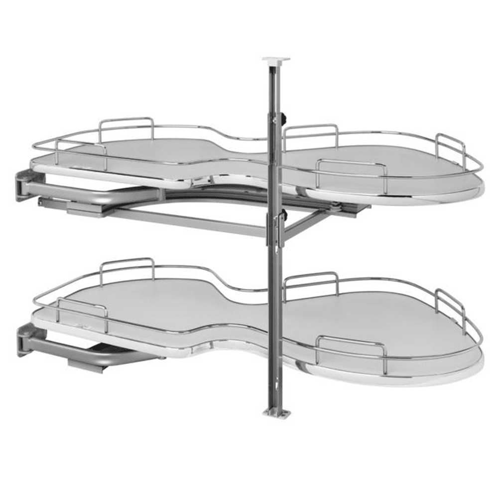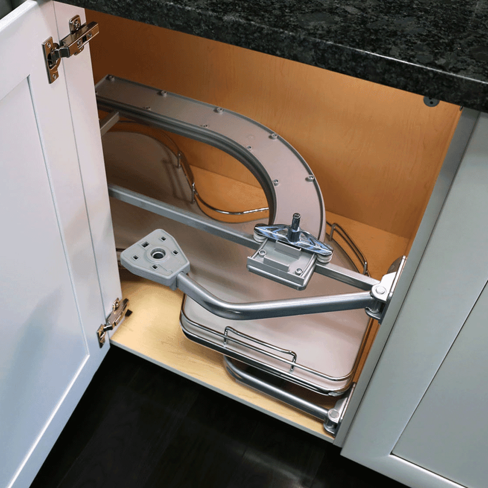 Blind corner cabinets don't have to be wasted space and lost items. Bring more functionality and accessibility to your cabinets with Rev-A-Shelf's Cloud. Designed to mount one tray to floor of cabinet and second tray as a floating shelf. No cabinet shelf needed to support second tray.\r