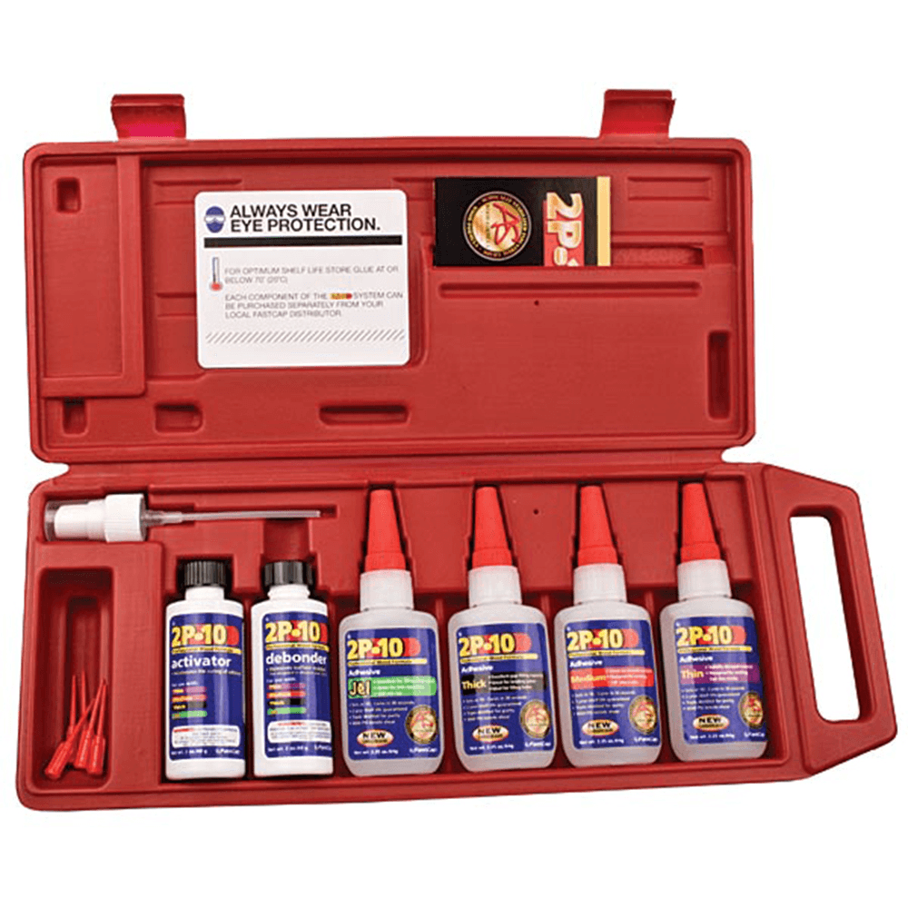 2P-10 is a two-part, ten-second adhesive. Just apply the adhesive, then spray the activator and stick it together for a strong, permanent bond. 2P-10 can be used on any material as long as it is clean and the surface is well prepared. The surface should be clean, with no oil, and slightly etched so the glue can bite more effectively. It should not be used in lieu of a weld (on metal), but it is very effective for tacking, to hold a piece in place.