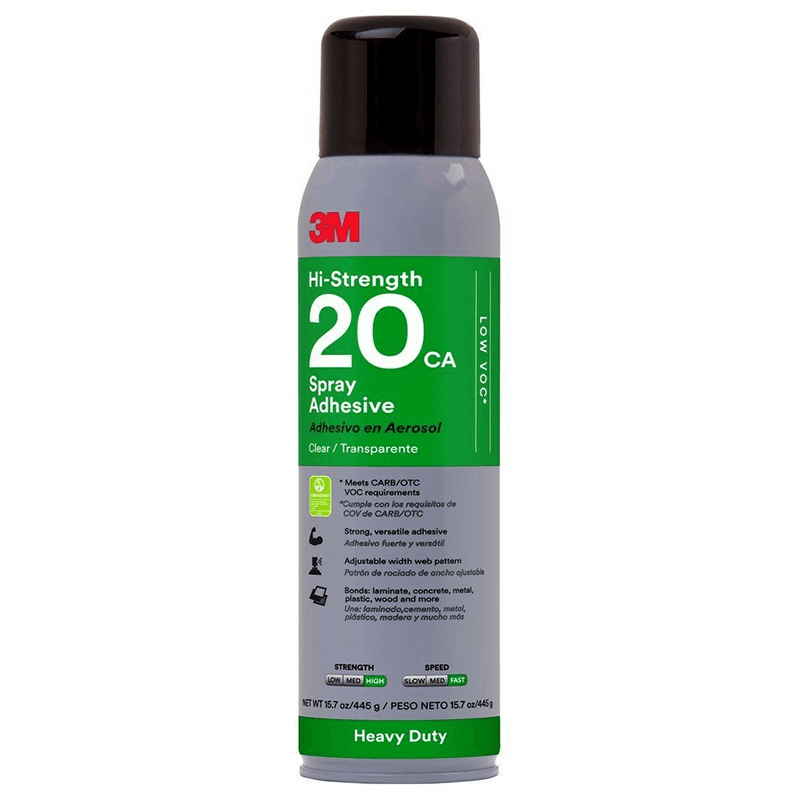 3M™ Heavy-duty 20CA Spray Adhesive is a clear, high-strength adhesive that bonds a range of large surfaces and is perfect for large-scale laminations. It shows aggressive initial tack with an extended open bond time of up to one hour.