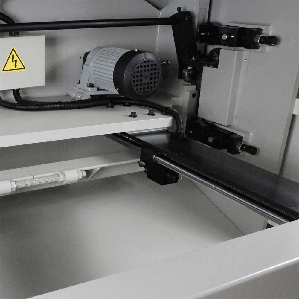 The Baileigh Industrial SH-5203-HD-NC is a heavy-duty hydraulic shear that is built for years of heavy cutting production requirements. This hydraulic shear can cut 52" wide sheet metal with a thickness up to 1/4" thick. The SH-5203-HD-NC sheet metal shearing machine comes standard with an upper blade carriage that rides in a 3-axis bearing housing that runs on a heavy-duty precision ground and hardened rail system for unbeatable accuracy and longevity of blade life. The Baileigh Industrial SH-5203-HD-NC heavy duty hydraulic shear is typically in stock for quick turn-around. For further information on our metal cutting shears, please feel free to contact a representative. Features: Eight hydraulic hold downs providing 3.2 tons of pressure each, ensure the sheet of metal doesn't lift while being sheared to the required length Shadow light stretches the entire length of the web width for proper placement of the beginning of the cut, for those one-off shearing requirements Heavy-duty hydraulic shear comes standard with a simple to operate control panel including the rake adjustment, jog/run/stop controls, program pad for the back gauge, and production counter Shears blade gap can be altered by a simple handle adjustment in seconds when changing material thicknesses High carbon chromium blades that have several edges, so as the blades wear, they can be flipped several times before re-sharpening is required Simple remote operator controls pendant house an E-Stop button and foot pedal controls The framework uses plate steel that is fully welded to increase stability and reduce vibration Metal Cutting Shear includes front and rear product supports, a roller in feed table, and side guides to easily maneuver the plate steel for the next cut Programmable quick change back gauge rides on a screw ball rail system that has a positioning encoder for accuracy
