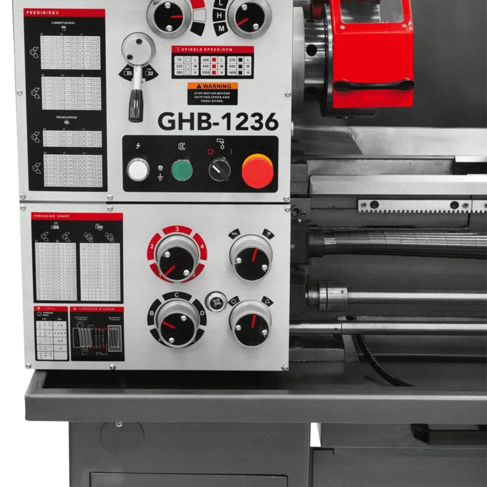 This new Jet GHB-1236 Geared Head Bench Lathe is engineered to cut and taper with exacting accuracy. Positioned on a heavy-duty cast iron stand with a newly added built-in footbrake, the GHB-1236 features precision induction hardened ground bed-ways, spindle roller bearings, and high-quality steel hardened gears in the headstock for ultimate working durability. Features: Compound and cross slide have backlash adjustment Emergency stop within easy reach of the Operator Enclosed gearbox design provides smooth, quiet operation Gearbox gives wide range of inch and metric threading and feed capabilities with few gear changes Induction hardened and ground bedway Mounted on stand with foot pedal, coolant and ready to use Spindle Spider available for ease of turning Gun barrels Steady Rest with Roller Bearings Tailstock may be offset for turning taper
