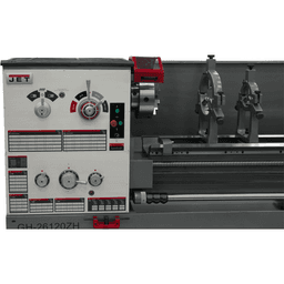 Constructed using the Certified Meehanite® casting process for added durability, the Jet ZH-Series 4-1/8" Spindle Bore Lathes provide consistent and reliable operation. Features include a clutch operated headstock with all headstock gears hardened and ground, a universal gearbox, fully integrated coolant system, and a rapid traverse on the apron that makes the ZH-Series perfect for high-output production applications. These are the features you've come to expect in a Jet Lathe that is backed by the industry-leading Jet Two Year Warranty. Features: 12" 3 Jaw scroll chuck with top reversing jaws 2 Steady rests with roller bearings Bed ways are induction hardened and ground for durability E-Stop on Carriage for added safety Electronic Chuck Key Holder Fitted top mats to hold tooling Full Length Splash Guard Heavy-duty tailstock and quill Large easy to use foot brake Rapid power traverse to cross slide and carriage