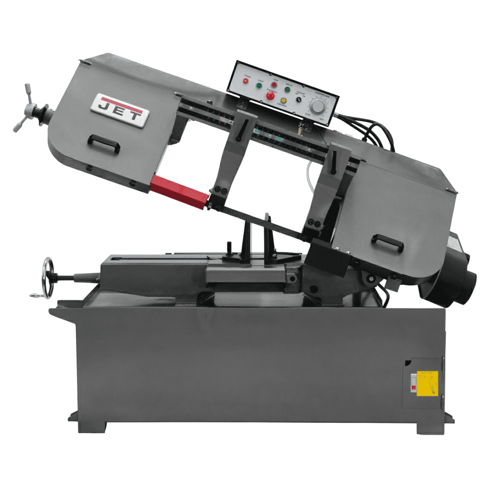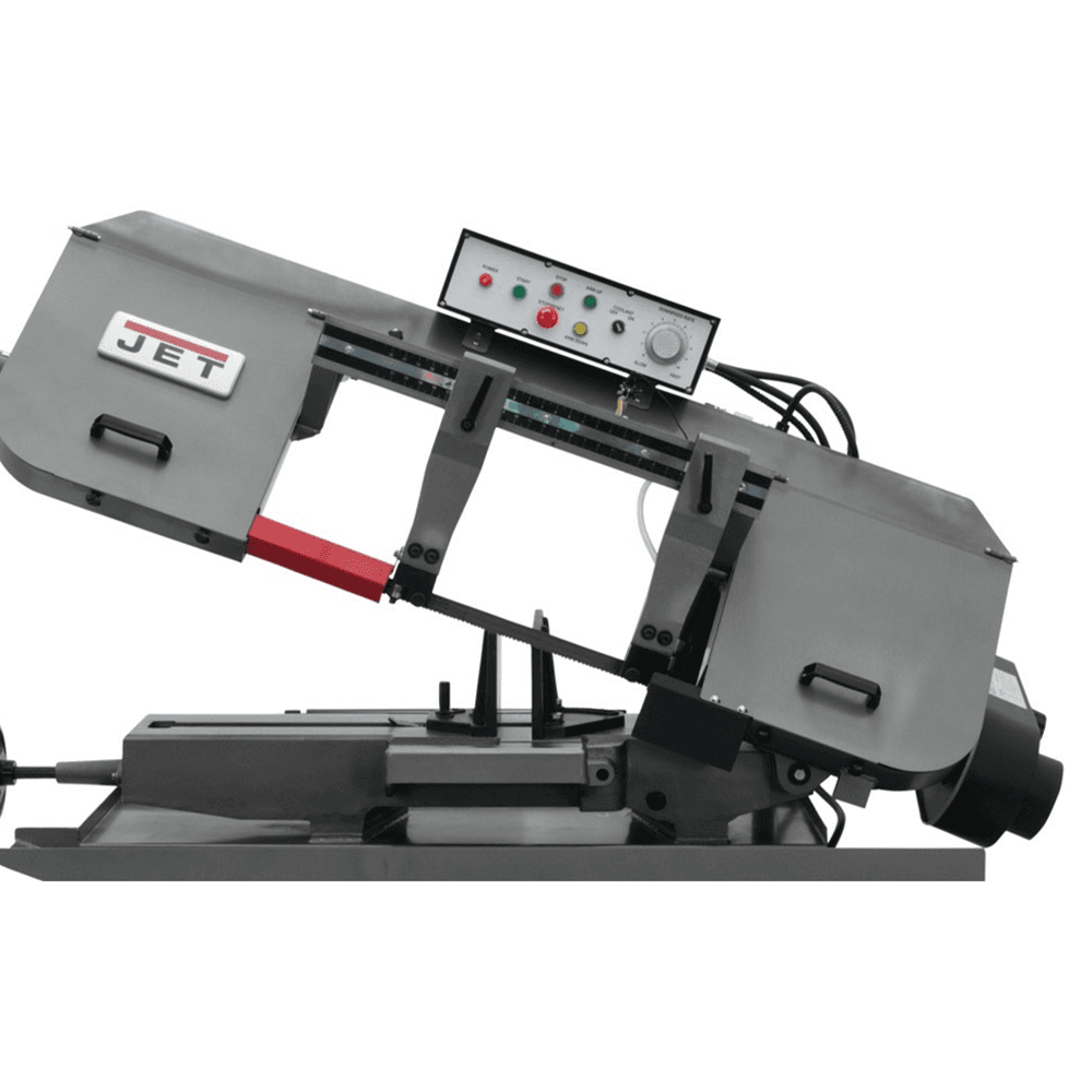 Loaded with operational and Safety features, the Jet HBS-1321W makes starting and completing any job a smooth operation. The semi-automatic bow raises after cut is complete to a predetermined height while the easy access chip tray allows for quick cleanup with help from the cleaning hose and nozzle which assist in washing chips away. Loaded with special features, this Jet saw is perfect for your shop or worksite. Features: Adjustable material stop Built-in, self-propelled blade brush extends blade life Carbide blade guides with roller bearings Coolant is distributed through the blade guides Fully adjustable hydraulic down feed controls the rate of decent Large hand wheel and built-in gauge provides easy blade tensioning Quick-positioning vise lessons set-up time Safety switch shuts off motor if band breaks Variable blade speed allows optimum cutting performance Variable blade speeds from 80 to 260 SFPM