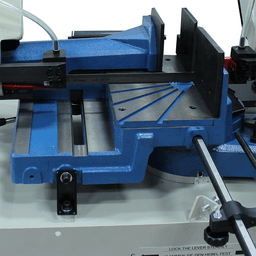 This dual-mitering band saw has a cast iron head and bow that can swivel 60° right and 45° left.