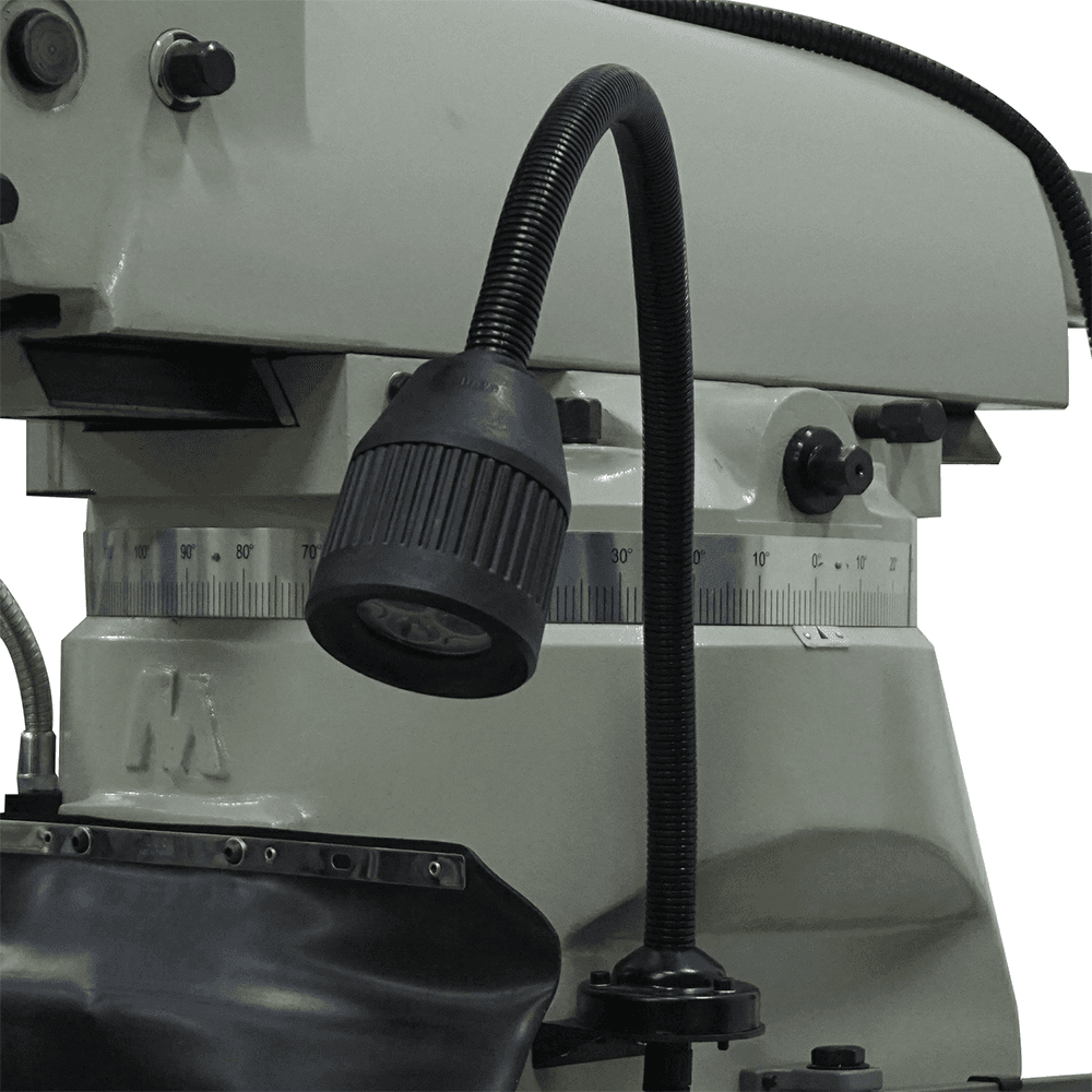 Variable spindle speed by adjustable sheaves/pulleys - Control spindle RPM with the turn of a handle Infinitely adjustable variable speed from 60 to 4,200rpm - Allows tooling to run at its intended speed, resulted in longer tool life and better finishes R8 spindle and drawbar - Accepts the most common tooling Meehanite® Casting - Rigid and dependable for decades of use Spindle brake - Easier tool changes and quick spindle stops 3 speed power quill feed w/ manual wheel - Perfect for boring and accurate, consistent work DRO for X and Y axes Power feed X axis w/ rapid - Consistent travel speed without tiresome cranking Dovetail ways w/ adjustable gibs - Keep tolerances tight year after year Taiwan lead screws w/ backlash adjustable nuts - Remove backlash instead of compensating for it Way covers and wipers - Keep chips off ways and bed Integrated coolant system w/ splash guard - Large 6-gallon reservoir in the base houses the pump. Plumbed return line from the table eliminates overflow and messes LED work light One-shot lubricator - Keep up on lubrication maintenance by simply pulling a lever Features: 9" x 49" table Variable speed: 60 to 4200rpm R8 spindle and drawbar DRO for X and Y axisSpecifications