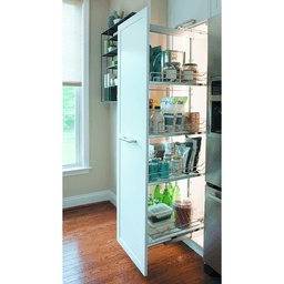 The DISPENSA Pantry is a fully customizable pantry unit perfect for kitchen pantries and linen closet storage solutions. Stabilized by dual mounting points on the cabinet door and base, the unique Synchromatic floor-mounted runner system ensures a smooth open and close every time, even with the full load capacity of 265 pounds. Kessebohmer′s Soft TopPro closure means that slamming doors are a thing of the past. The patented Click Fixx technology makes for a tool-less assembly and simple adjustment.