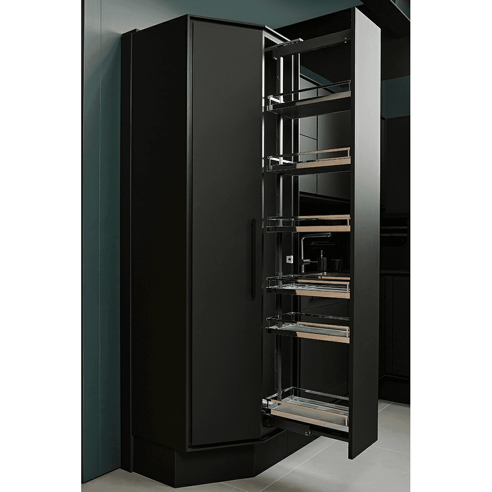 The DISPENSA Pantry is a fully customizable pantry unit perfect for kitchen pantries and linen closet storage solutions. Stabilized by dual mounting points on the cabinet door and base, the unique Synchromatic floor-mounted runner system ensures a smooth open and close every time, even with the full load capacity of 265 pounds. Kessebohmer′s Soft TopPro closure means that slamming doors are a thing of the past. The patented Click Fixx technology makes for a tool-less assembly and simple adjustment.