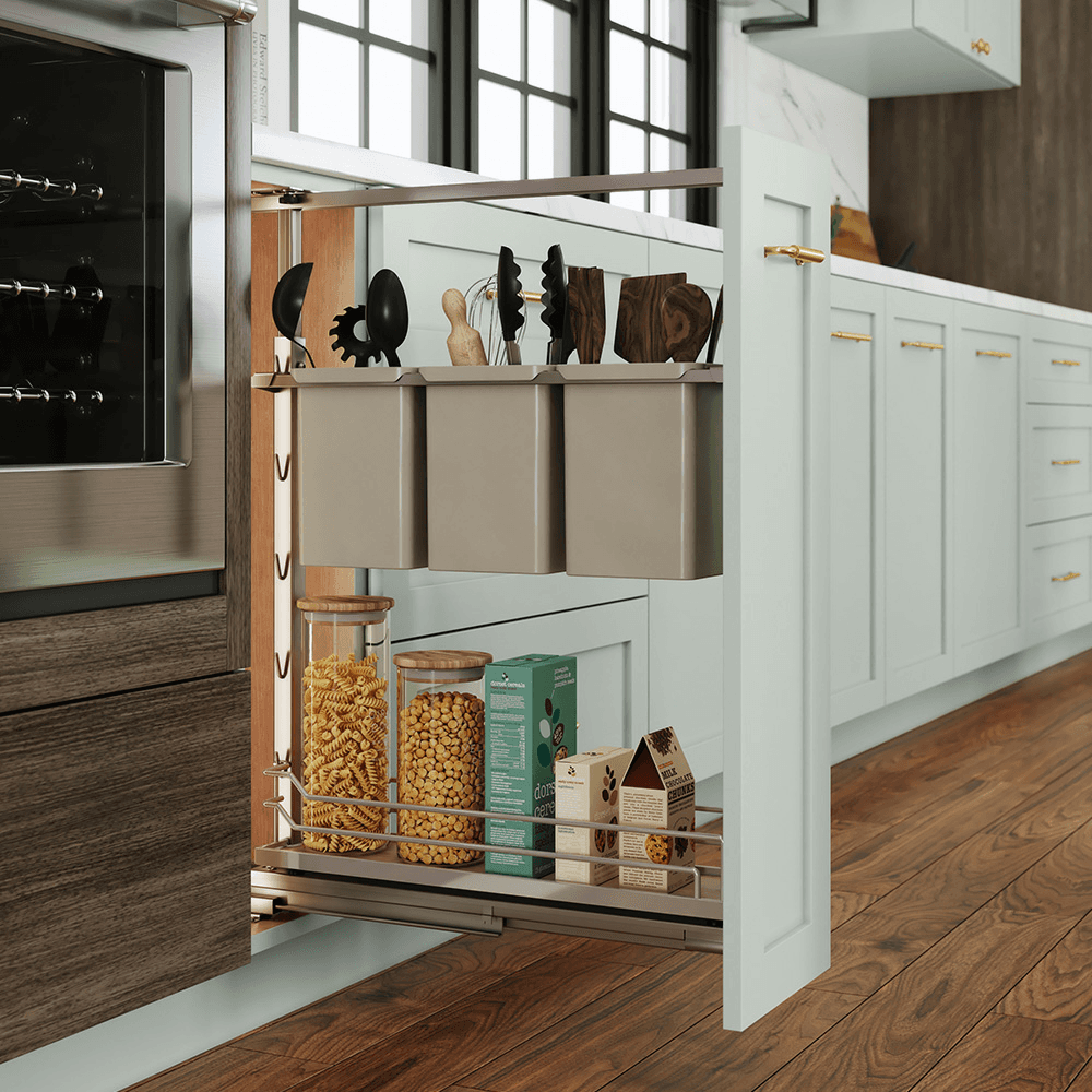 Base Pullout combines style, convenience, and versatility. Mix and match shelving and accessories to create a unique kitchen base cabinet pullout that suits your individual needs. The unique top and bottom mounted runners make for a smooth open and soft-close. Optional accessories such as our Spice Tray rollout spice rack, Baker’s Tray cutting board and sheet pan holder, or YOUBOXX organizational system allow you to customize your base cabinet.