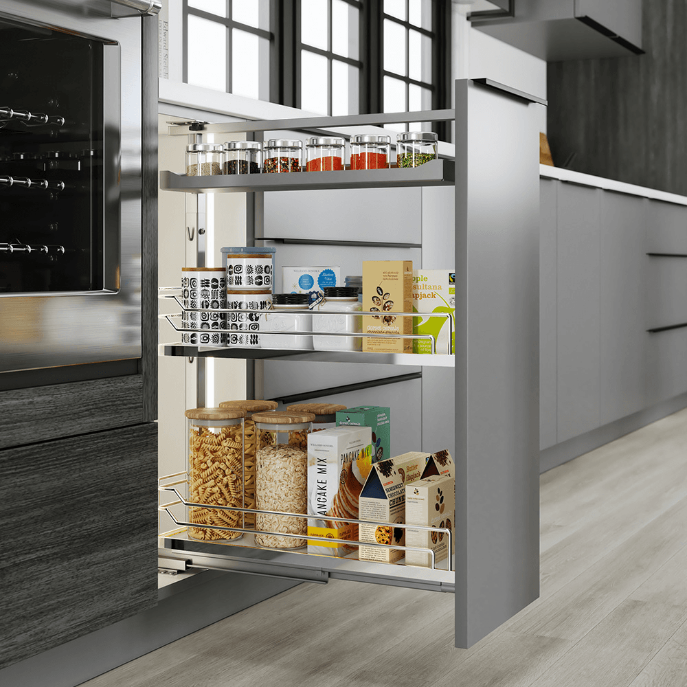 Base Pullout combines style, convenience, and versatility. Mix and match shelving and accessories to create a unique kitchen base cabinet pullout that suits your individual needs. The unique top and bottom mounted runners make for a smooth open and soft-close. Optional accessories such as our Spice Tray rollout spice rack, Baker’s Tray cutting board and sheet pan holder, or YOUBOXX organizational system allow you to customize your base cabinet.