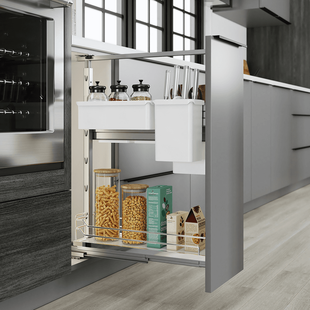 Base Pullout combines style, convenience, and versatility. Mix and match shelving and accessories to create a unique kitchen base cabinet pullout that suits your individual needs. The unique top and bottom mounted runners make for a smooth open and soft-close. Optional accessories such as our Spice Tray rollout spice rack, Baker’s Tray cutting board and sheet pan holder, or YOUBOXX organizational system allows to customize your base cabinet.