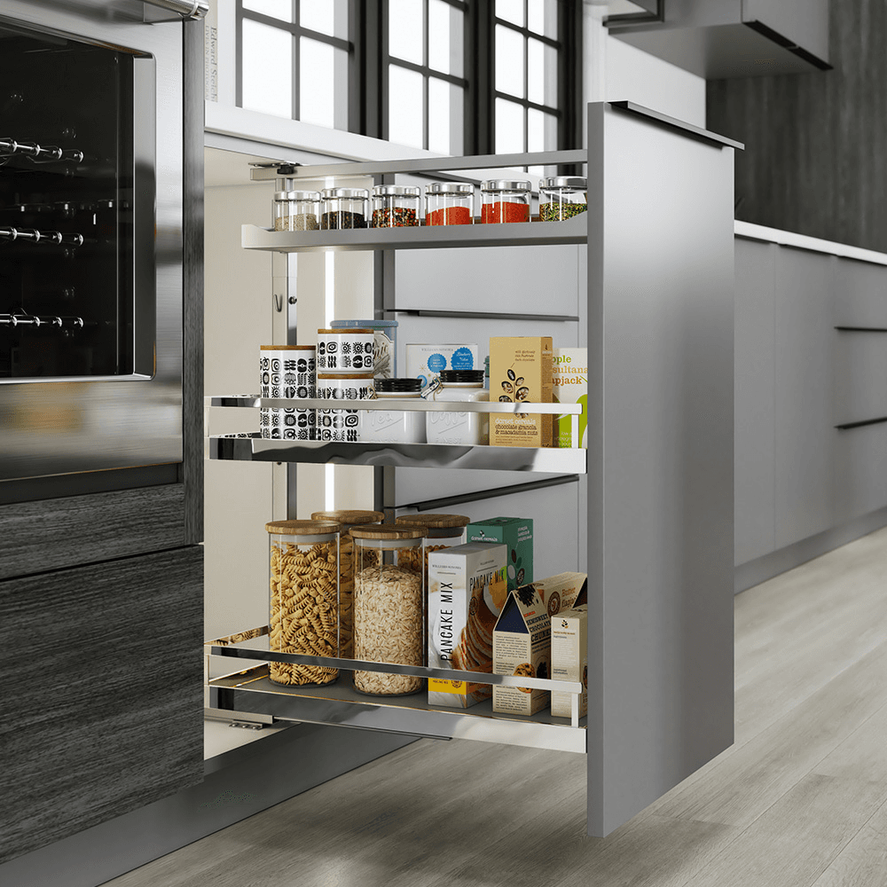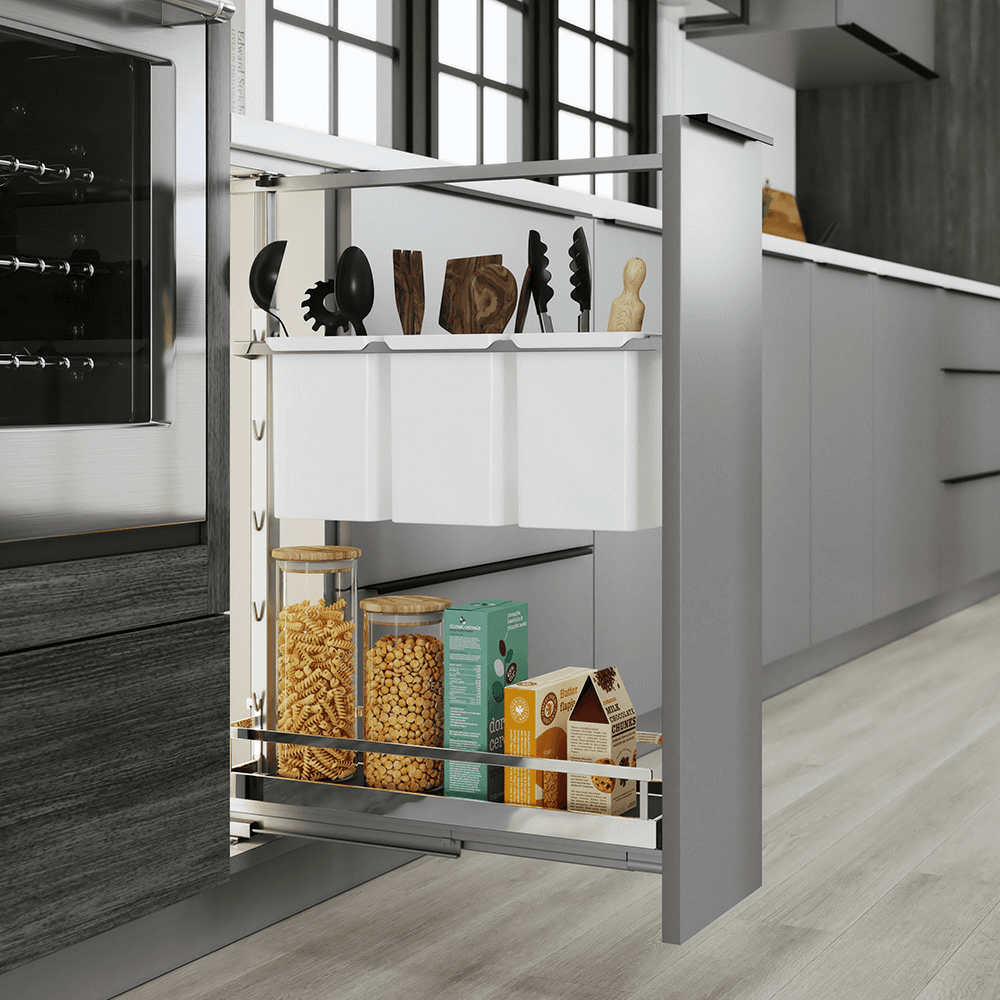 Base Pullout combines style, convenience, and versatility. Mix and match shelving and accessories to create a unique kitchen base cabinet pullout that suits your individual needs. The unique top and bottom mounted runners make for a smooth open and soft-close. Optional accessories such as our Spice Tray rollout spice rack, Baker’s Tray cutting board and sheet pan holder, or YOUBOXX organizational system allows to customize your base cabinet.