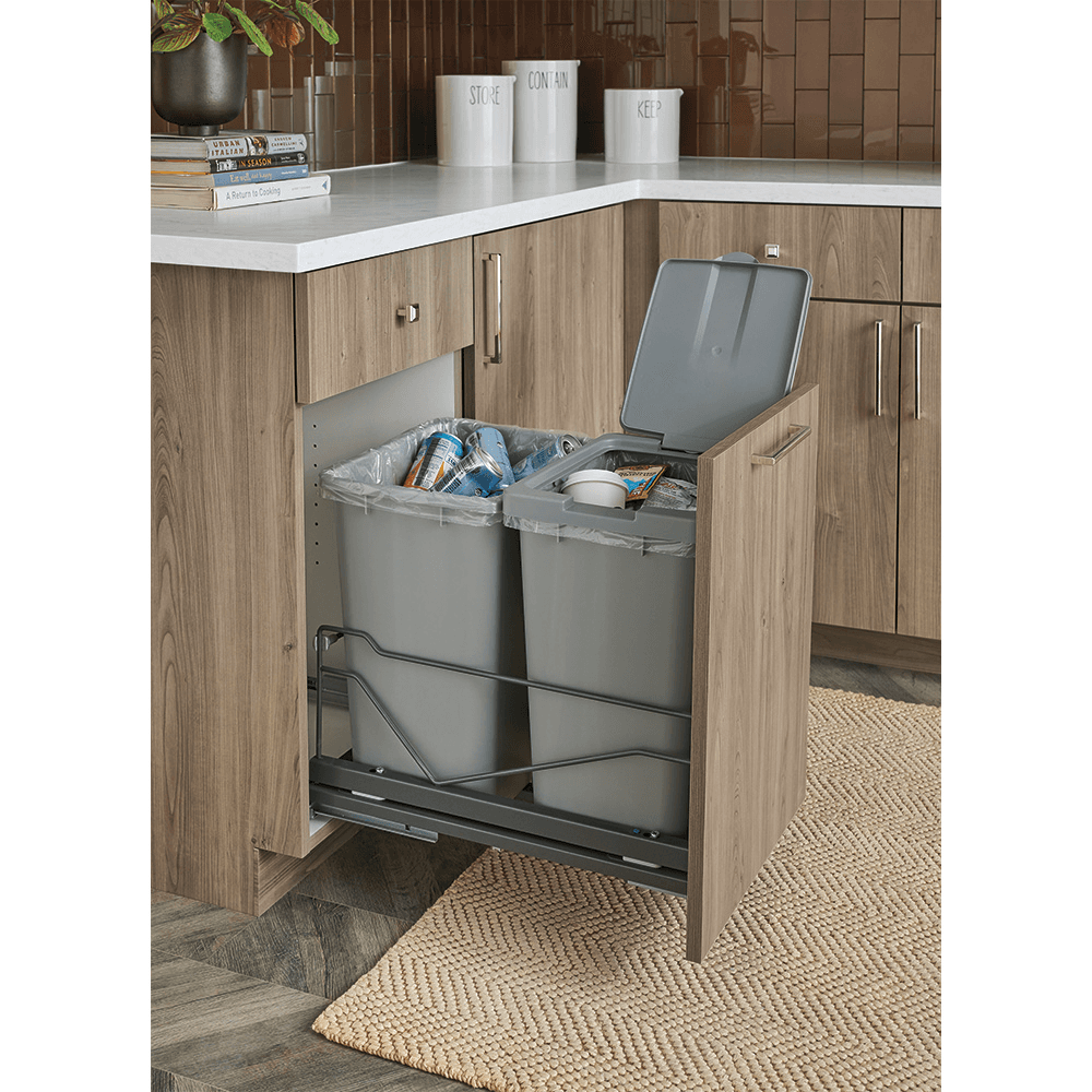 Kessebohmer’s Wastebin Pullout is designed for total convenience. With improved space utilization and a new “v” shaped rail to improve stabilization, the Wastebin Pullout is even more user-friendly. A sturdy frame keeps bins securely in place to help eliminate spills and messes. Every detail of the Wastebin Pullout has been optimized to maximize usable space, and the unique Click Fixx assembly makes installation a breeze! Choose a single bin for smaller spaces or double bins to separate trash and recyclables. Accessorize your Wastebin Pullout with our optional mechanical Push-to-Open kit so you can operate your unit hands-free.
