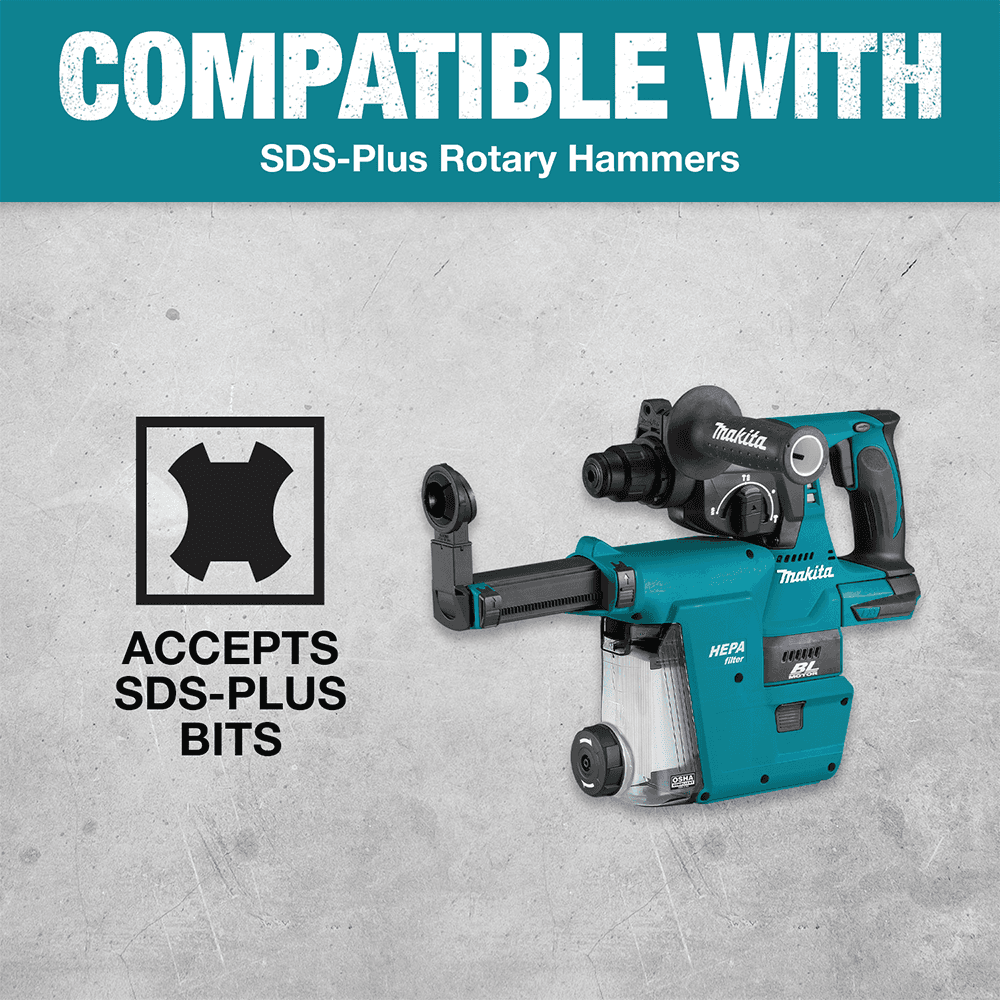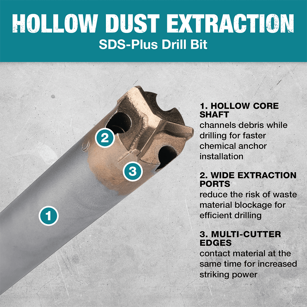 Features dust extraction ports for removal of dust from the hole while drilling Drilling and hole cleaning in one step for faster chemical anchor installation Reduces airborne silica dust and offers increased productivity during chemical anchor installation SDS-Plus Dust Extraction Drill Bits are an OSHA Table 1 compliant solution when used in conjunction with approved control dust extractor vacuum 3 cutting edges for maximum performance, rebar resistance and more accurate holes 3 cutting edges help prevent cracking of the surrounding concrete 3 supports between each edge provide more accurate holes Self-centering tungsten carbide tip helps drive the bit straight Dust evacuation increases drilling speed and improves drill bit life 10-3/8" usable length Fits most common dust extractor vacuums For use with Rotary Hammers that accept SDS-Plus shank bitsSpecifications