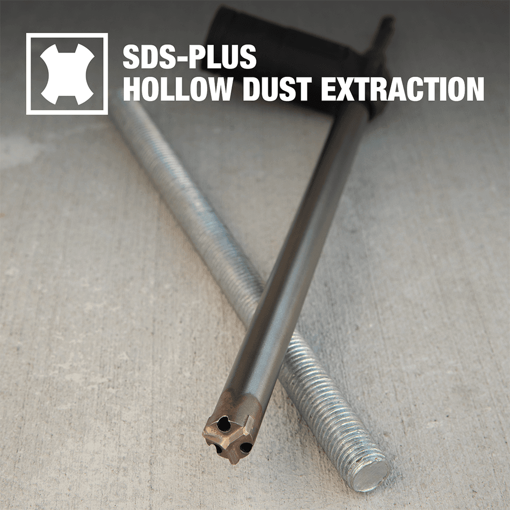 There is increased awareness of dust extraction, so if you′re drilling concrete get the best solution with the SDS-PLUS Hollow Dust Extraction Drill Bit. The Bit features dust extraction ports so when used with a rotary hammer and dust extractor (sold separately), it offers drilling and hole cleaning in one step, and reduces airborne silica dust. SDS-PLUS Hollow Dust Extraction Drill Bits are an OSHA Table 1 compliant solution when used in conjunction with an approved control dust extractor vacuum (sold separately). The Bit features 3 cutting edges for maximum performance, rebar resistance, and more accurate holes. There are 3 cutting edges that are engineered to help prevent cracking of the surrounding concrete, and 3 supports between each edge to provide more accurate holes. Added features include a self-centering Tungsten carbide tip to help drive the bit straight.