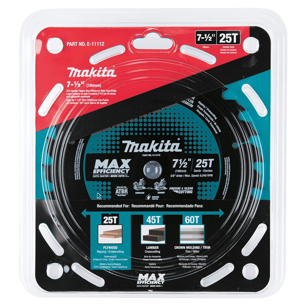 The 7-1/2" 25 tooth tungsten carbide tipped max efficiency miter saw blades deliver smoother, faster cuts with a thinner kerf design for less drag on the motor and minimal material loss. The tungsten carbide-tipped cutting edges allow for precise and true cuts whether cross-cutting or ripping. Max Efficiency Blades are engineered for efficient cutting with up to 60% more cuts per charge over standard blades. It is an ideal blade for use with a Miter Saw (sold separately).