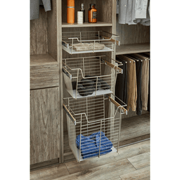 Features: 18" pull-out steel closet basket in matte black finish 3-Piece zinc plated full extension ball-bearing slide system Baskets work in industry standard 32mm hole systems Baskets are intended to fit in industry standard closet opening Easy-to-remove baskets rest securely on hooks Sidelines branded products are intended to match color/finish of other Sidelines organizers Designed for 14" or deeper closet system Closet basket liners Provides both durability and elegance with its heavy gauge wire construction Mounts to side of a closet panel TSCA Title VI compliant