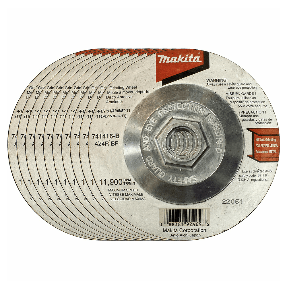 4-1/2" 24 grit hubbed grinding wheel Hubbed design for quick wheel changes Aluminum oxide abrasive grains are evenly distributed to give a smooth surface Innovative grain structure engineered for optimum performance, efficient material removal and longer wheel life Ideal for grinding ferrous metals and metal polishing Constructed with aluminum oxide grade 24 For use with 4-1/2" angle grinders Convenient 10 packSpecifications