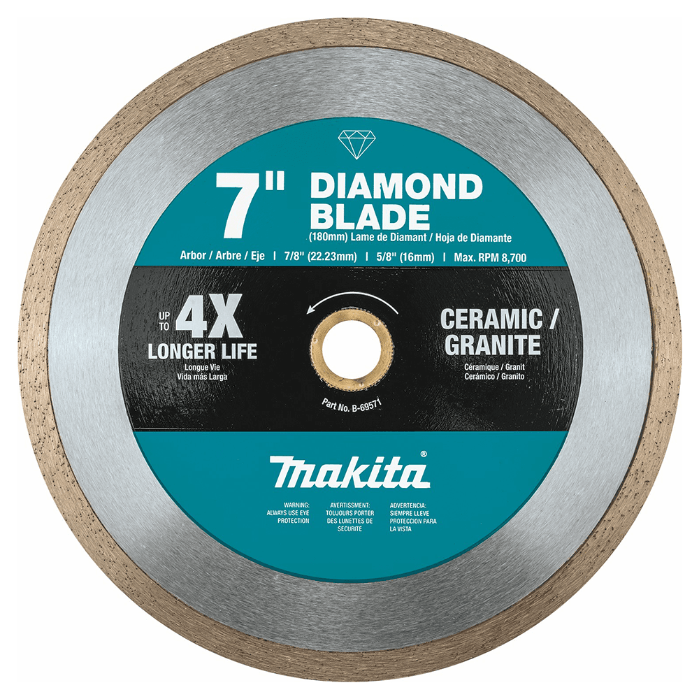 Optimum bond matrix provides a faster, longer lasting, and smoother cutting General purpose blade for use cutting tile, porcelain and stone Constant contact with material delivers a more precise and smoother finish than segmented blades High quality diamonds for longer life and faster cutting Up to 4X longer life than competitive blades Expertly balanced premium steel core for reduced vibration and noise Dry or wet cutting for added versatility For use with angle grinders or masonry saws Max RPM 8,700Specifications