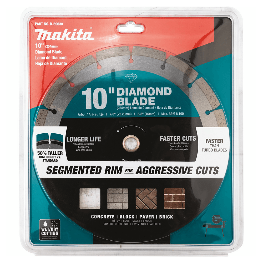 50% taller segments are designed for longer life and faster cutting General purpose blade for cutting cured concrete, block, brick and pavers Expertly balanced premium steel core for reduced vibration and noise Segment slots help deliver a faster, cooler cut in multiple applications Optimum bond matrix provides a faster, longer lasting, and smoother cutting Faster cutting than turbo blades Strict quality control measures ensure superior performance Dry or wet cutting for added versatility Made with high quality diamonds For use with 10" saws Max RPM 6,100Specifications
