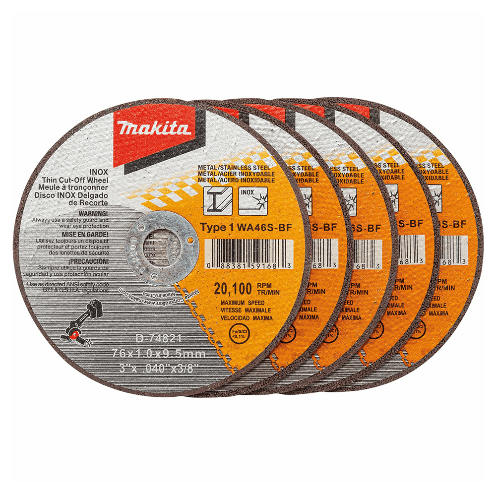 The 3" x .040" x 3/8" Type 1 general purpose 46 grit thin cut-off wheel for metal and stainless-steel cutting, 5-pack, (D-74821-5) is for use with the 18V LXT brushless 3" cut-off tool (XCM01Z, Tool Only), as well as for use with select grinders with a 3/8" arbor. The industrial design delivers clean finish cuts in a variety of materials. The 0.04" thin wheel is engineered for faster cutting and reduced material waste. The thin wheel design requires less energy for improved battery life when used with cordless grinders. The blade is constructed of white aluminum oxide and reinforced with a resinoid bond for faster cutting and longer life. The soft, 46-grit cut-off wheel provides cleaner cuts in non-ferrous material, including stainless steel. The cut-off wheel features Type 1 flat wheel design for straight-on cutting and minimal interference with the workpiece. For use in making precise cuts in metal and stainless steel. The multi-pack delivers bulk value by reducing the cost per piece.