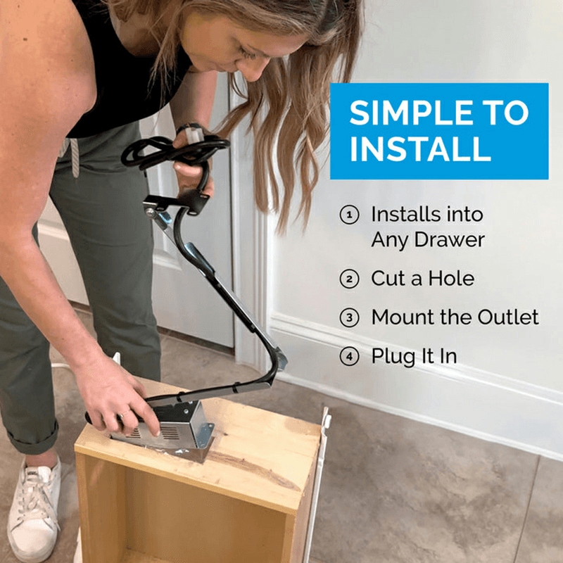 Docking Drawer is the market leader of in-drawer outlets, offering the only ETL-Listed solution unsurpassed in both safety and quality. Designed intentionally for use inside a drawer, our outlets feature an integrated thermostat that cuts power if surrounding temperatures exceed 120°F and cable management arms that guide and protect the power cord as the drawer opens and closes. Premium, all-metal components guarantee long-lasting durability, while the capacity to easily update the outlet as technology changes over time ensures lifelong usability. Install our in-drawer outlets with ease into drawers of any type to eliminate cord and device clutter from countertops and surfaces for more organized and functional spaces. Features: Docking drawer Blade in-drawer in white finish A mix of (2) USB-C PD and (2) AC ports support fast charging and the connection of up to 4 devices 65 Watts of power will charge multiple USB-C devices at the fastest possible speed Featuring a compact, fully corded design, this outlet can be easily installed into drawers of every type without requiring drawer box modifications This ETL Listed outlet comes with an integrated thermostat that cuts power if drawer box temperatures exceed 120°F, making them safe and certified for applications of every kind All-metal construction guarantees lifelong durability Eliminate countertop cord and device clutter by adding Docking Drawer outlets to new or existing drawers of every kind Recommended locations for the In-Cabinet electrical supply Do NOT put the electrical supply directly behind the drawer box as it may interfere with the cable management arms Compatible with safety interlock outlet with blade limit switch Interlock Safety Feature: Interlocking Thermostat Electrical Connection: NEMA 5-15P Narrow drawer tip Compatible with soft close guides 5 years warranty Outlet Configuration and Specifications: (2) 65W and (2) AC: AC - 15-amps @ 120 VAC, USB-C (PD) 65 Watt Shared, USB-C (single port connected to PD device): 65W 5V/3A; 9V/3A; 12V/3A; 15V/3A; 20V/3.25A, USB-C (both ports connected to PD devices): 65W total C1/C2: 5V/3A; 9V/3A; 12V/2.5A; 15V/2A; 20V/1.5A