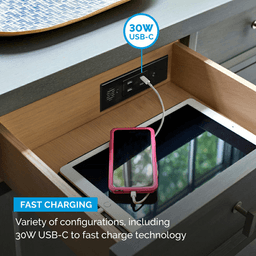 Docking Drawer is the market leader of in-drawer outlets, offering the only ETL-Listed solution unsurpassed in both safety and quality. Designed intentionally for use inside a drawer, our outlets feature an integrated thermostat that cuts power if surrounding temperatures exceed 120°F and cable management arms that guide and protect the power cord as the drawer opens and closes. Premium, all-metal components guarantee long-lasting durability, while the capacity to easily update the outlet as technology changes over time ensures lifelong usability. Install our in-drawer outlets with ease into drawers of any type to eliminate cord and device clutter from countertops and surfaces for more organized and functional spaces. Features: Docking drawer Blade in-drawer in black finish A mix of (2) USB-C PD and (2) USB-A ports supports fast charging and the connection of up to 4 devices Featuring a compact, fully corded design, this outlet can be easily installed into drawers of every type without requiring drawer box modifications This ETL Listed outlet comes with an integrated thermostat that cuts power if drawer box temperatures exceed 120°F, making them safe and certified for applications of every kind All-metal construction guarantees lifelong durability Eliminate countertop cord and device clutter by adding Docking Drawer outlets to new or existing drawers of every kind Recommended locations for the In-cabinet electrical supply Do NOT put the electrical supply directly behind the drawer box as it may interfere with the cable management arms Compatible with safety interlock outlet with blade limit switch Interlock Safety Feature: Interlocking Thermostat Electrical Connection: NEMA 5-15P Narrow drawer tip Compatible with soft close guides 5 years warranty Outlet Configuration and Specifications: (2) 30W USB-C and (2) USB-A: USB-C (PD) 30 Watt Shared, USB-C (single port connected to PD device): 30W max 5V/3A; 9V/3A; 12V/3A; 15V/3A; 15V/2A; 20V/1.5A, USB-C (both ports connected): 15W each port C1:5V/3A C2:5V/3A, USB-A (max with one or both ports connected) 12W total 5v/2.4A