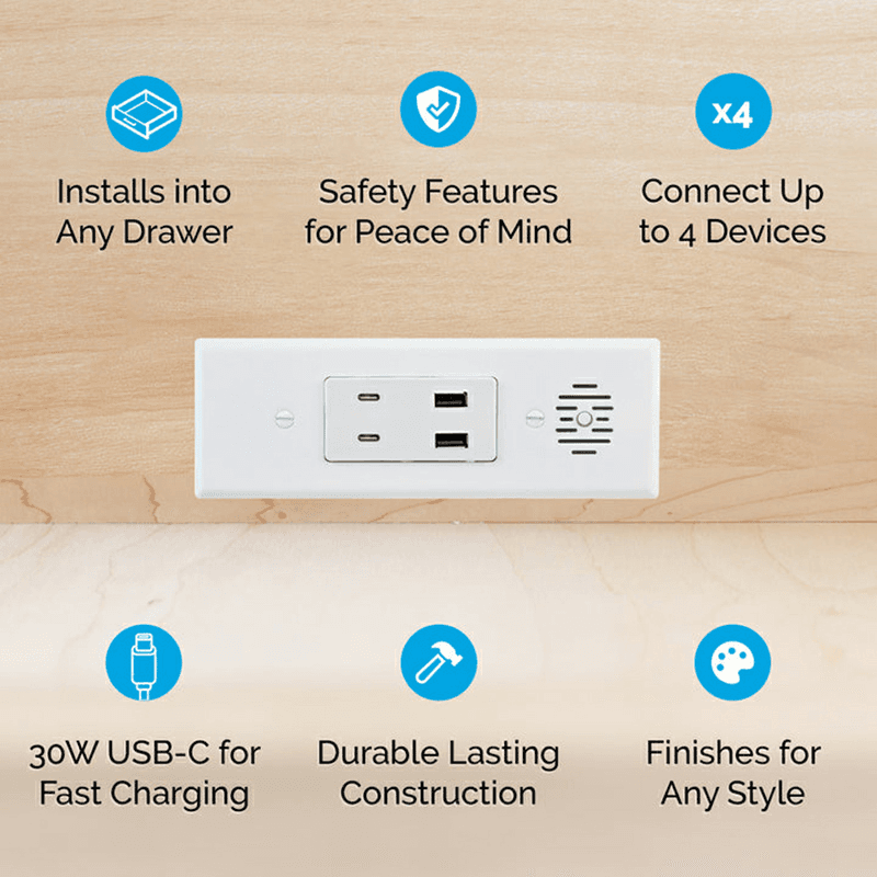 Docking Drawer is the market leader of in-drawer outlets, offering the only ETL-Listed solution unsurpassed in both safety and quality. Designed intentionally for use inside a drawer, our outlets feature an integrated thermostat that cuts power if surrounding temperatures exceed 120°F and cable management arms that guide and protect the power cord as the drawer opens and closes. Premium, all-metal components guarantee long-lasting durability, while the capacity to easily update the outlet as technology changes over time ensures lifelong usability. Install our in-drawer outlets with ease into drawers of any type to eliminate cord and device clutter from countertops and surfaces for more organized and functional spaces. Features: Docking drawer Blade in-drawer in stainless steel finish A mix of (2) USB-C PD and (2) USB-A ports supports fast charging and the connection of up to 4 devices Featuring a compact, fully corded design, this outlet can be easily installed into drawers of every type without requiring drawer box modifications This ETL Listed outlet comes with an integrated thermostat that cuts power if drawer box temperatures exceed 120°F, making them safe and certified for applications of every kind All-metal construction guarantees lifelong durability Eliminate countertop cord and device clutter by adding Docking Drawer outlets to new or existing drawers of every kind Recommended locations for the In-cabinet electrical supply Do NOT put the electrical supply directly behind the drawer box as it may interfere with the cable management arms Compatible with safety interlock outlet with blade limit switch Interlock Safety Feature: Interlocking Thermostat Electrical Connection: NEMA 5-15P Narrow drawer tip Compatible with soft close guides 5 years warranty Outlet Configuration and Specifications: (2) 30W USB-C and (2) USB-A: USB-C (PD) 30 Watt Shared, USB-C (single port connected to PD device): 30W max 5V/3A; 9V/3A; 12V/3A; 15V/3A; 15V/2A; 20V/1.5A, USB-C (both ports connected): 15W each port C1:5V/3A C2:5V/3A, USB-A (max with one or both ports connected) 12W total 5v/2.4A