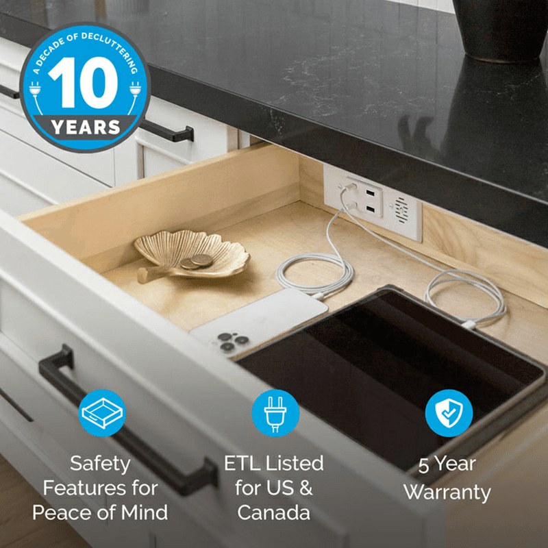Docking Drawer is the market leader of in-drawer outlets, offering the only ETL-Listed solution unsurpassed in both safety and quality. Designed intentionally for use inside a drawer, our outlets feature an integrated thermostat that cuts power if surrounding temperatures exceed 120°F and cable management arms that guide and protect the power cord as the drawer opens and closes. Premium, all-metal components guarantee long-lasting durability, while the capacity to easily update the outlet as technology changes over time ensures lifelong usability. Install our in-drawer outlets with ease into drawers of any type to eliminate cord and device clutter from countertops and surfaces for more organized and functional spaces. Features: Docking drawer Blade in-drawer in white finish A mix of (2) USB-C PD and (2) USB-A ports supports fast charging and the connection of up to 4 devices Featuring a compact, fully corded design, this outlet can be easily installed into drawers of every type without requiring drawer box modifications This ETL Listed outlet comes with an integrated thermostat that cuts power if drawer box temperatures exceed 120°F, making them safe and certified for applications of every kind All-metal construction guarantees lifelong durability Eliminate countertop cord and device clutter by adding Docking Drawer outlets to new or existing drawers of every kind Recommended locations for the In-cabinet electrical supply Do NOT put the electrical supply directly behind the drawer box as it may interfere with the cable management arms Compatible with safety interlock outlet with blade limit switch Interlock Safety Feature: Interlocking Thermostat Electrical Connection: NEMA 5-15P Narrow drawer tip Compatible with soft close guides 5 years warranty Outlet Configuration and Specifications: (2) 30W USB-C and (2) USB-A: USB-C (PD) 30 Watt Shared, USB-C (single port connected to PD device): 30W max 5V/3A; 9V/3A; 12V/3A; 15V/3A; 15V/2A; 20V/1.5A, USB-C (both ports connected): 15W each port C1:5V/3A C2:5V/3A, USB-A (max with one or both ports connected) 12W total 5v/2.4A
