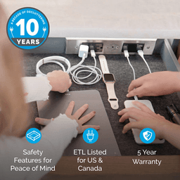 Docking Drawer is the market leader of in-drawer outlets, offering the only ETL-Listed solution unsurpassed in both safety and quality. Designed intentionally for use inside a drawer, our outlets feature an integrated thermostat that cuts power if surrounding temperatures exceed 120°F and cable management arms that guide and protect the power cord as the drawer opens and closes. Premium, all-metal components guarantee long-lasting durability, while the capacity to easily update the outlet as technology changes over time ensures lifelong usability. Install our in-drawer outlets with ease into drawers of any type to eliminate cord and device clutter from countertops and surfaces for more organized and functional spaces. Features: Docking drawer Blade Duo in-drawer outlet in white finish A mix of (4) USB-C PD, (2) USB-A and (2) AC ports supports fast charging and the connection of up to 8 devices Featuring a compact, fully corded design, this outlet can be easily installed into drawers of every type without requiring drawer box modifications This ETL Listed outlet comes with an integrated thermostat that cuts power if drawer box temperatures exceed 120°F, making them safe and certified for applications of every kind All-metal construction guarantees lifelong durability Eliminate countertop cord and device clutter by adding Docking Drawer outlets to new or existing drawers of every kind Recommended locations for the In-cabinet electrical supply Do NOT put the electrical supply directly behind the drawer box as it may interfere with the cable management arms Electrical Connection: NEMA 5-15P 5 years warranty Outlet Configuration and Specifications: (2) 30W USB-C and (2) AC: AC - 15-amps @ 120 VAC, USB-C (single port connected to PD device): 3 amps @ 9 VDC (30W), USB-C (single port connected to non-PD device): 3 amps @ 5 VDC (15W), USB-C (both ports connected): 3 amps @ 5 VDC (30W total power) (2) 30W USB-C and (2) USB-A: USB-C (PD) 30 Watt Shared, USB-C (single port connected to PD device): 30W max 5V/3A; 9V/3A; 12V/3A; 15V/3A; 15V/2A; 20V/1.5A, USB-C (both ports connected): 15W each port C1:5V/3A C2:5V/3A, USB-A (max with one or both ports connected) 12W total 5v/2.4A