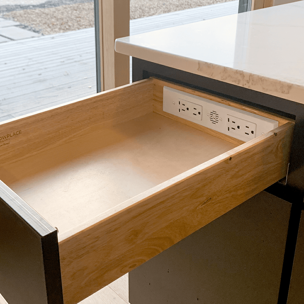 Docking Drawer is the market leader of in-drawer outlets, offering the only ETL-Listed solution unsurpassed in both safety and quality. Designed intentionally for use inside a drawer, our outlets feature an integrated thermostat that cuts power if surrounding temperatures exceed 120°F and cable management arms that guide and protect the power cord as the drawer opens and closes. Premium, all-metal components guarantee long-lasting durability, while the capacity to easily update the outlet as technology changes over time ensures lifelong usability. Install our in-drawer outlets with ease into drawers of any type to eliminate cord and device clutter from countertops and surfaces for more organized and functional spaces. Features: Docking drawer Blade Duo in-drawer outlet in stainless steel finish A mix of (4) USB-C PD and (4) AC ports support fast charging and the connection of up to 8 devices 65 Watts of power will charge multiple USB-C devices at the fastest possible speed Featuring a compact, fully corded design, this outlet can be easily installed into drawers of every type without requiring drawer box modifications This ETL Listed outlet comes with an integrated thermostat that cuts power if drawer box temperatures exceed 120°F, making them safe and certified for applications of every kind All-metal construction guarantees lifelong durability Eliminate countertop cord and device clutter by adding Docking Drawer outlets to new or existing drawers of every kind Recommended locations for the In-cabinet electrical supply Do NOT put the electrical supply directly behind the drawer box as it may interfere with the cable management arms Compatible with safety interlock outlet with blade limit switch Compatible with soft close guides Electrical Connection: NEMA 5-15P 5 years warranty Outlet Configuration and Specifications: (2) 65W and (2) AC: AC - 15-amps @ 120 VAC, USB-C (PD) 65 Watt Shared, USB-C (single port connected to PD device): 65W 5V/3A; 9V/3A; 12V/3A; 15V/3A; 20V/3.25A, USB-C (both ports connected to PD devices): 65W total C1/C2: 5V/3A; 9V/3A; 12V/2.5A; 15V/2A; 20V/1.5A