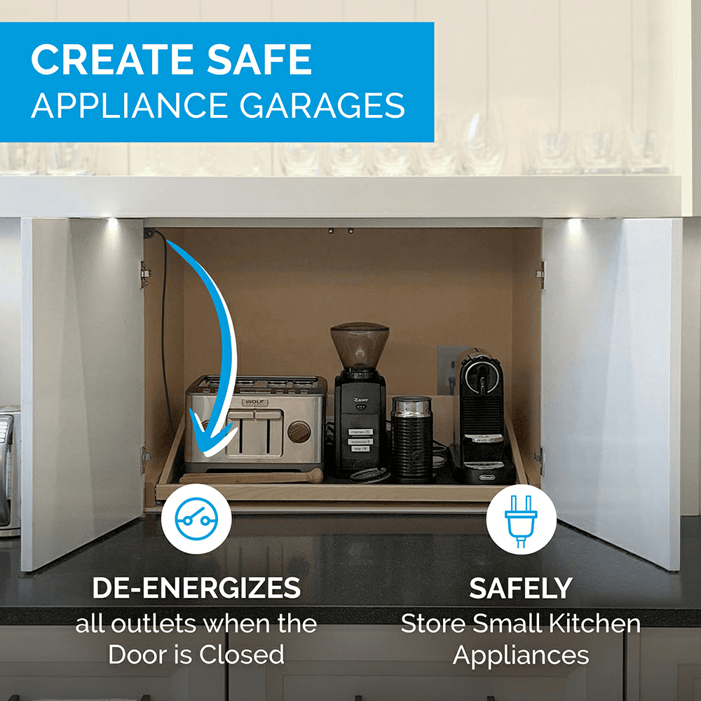 Designed for use as an added layer of safety in powered appliance garages, the Corner Mount Limit Switch senses the cabinet door position, de-energizing the safety outlet and all connected appliances depending on which limit switch is selected. Features: 15-amp safety interlock outlet with corner mount limit switch Smart Technology: Create safe, non-energized enclosed spaces Enhanced Safety: Switch automatically turns OFF power when depressed Easy Installation: Replaces single-gang wall receptacle; side-mounts behind cabinet doors Peace of Mind: Ensures heat-generating appliances are off inside closed cabinet spaces Configuration: Directly connects one appliance with a single plug for convenience ETL Listed: Complies with NEC and CEC standards and is certified for UL 498, CSA 22.2 #42 15-amp Outlet Specification: Input: 100 - 125 VAC, 50/60 Hz AC Output: 15A@125VAC, 1875 VA MAX, 1/2 HP DC Output: 24VDC @ 100mA MAX DC Power Supply: IEC Class II Number of Receptacles: (1) NEMA 5-15R Tamper Resistant: Yes LED Indicator: Yes Conformance: UL60730, UL498, EN 61558, EN60730, EN62386, CSA C22.2#42 Environmental: -10C to +50C, non condensing 2 Years Warranty Limit Switch Specification: Type of Limit Switch: Corner Mount Limit Switch Limit Switch Cable: 6 ft 24 VDC low voltage cable Switch Length: 1" (25.4mm) Switch Width: 1" (25.4mm) Switch Height: 1" (25.4mm) Mounting Details: Can install in the corner of any cabinet or enclosed space behind the hinged side of the door Conformance: UL60730, UL498, EN 61558, EN60730, EN62386, CSA C22.2#42