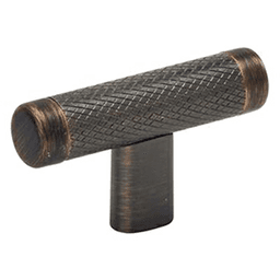 The subtle knurling of the Bronx collection adds a sophisticated and modern industrial twist to the traditional bar pull, certain to add designer flair to any space. Features: 2-5/8" Bronx cabinet t-knob in oil-rubbed bronze finish Contemporary style adds an easy designer upgrade to any cabinet drawer, cabinet door or furniture piece High quality zinc/stainless steel construction for lifelong durability Mounting hardware included for quick and easy installation Coordinates seamlessly with finishes from popular plumbing and lighting brands Complete with limited lifetime warranty against defect in material and craftsmanship Included Hardware: #8-32 x 1" and #8-32 x 1-1/2" Truss Head Machine Screws