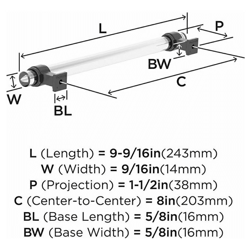 In the Glacio collection, graceful metallic mountings hold clear accents that seem to float above the surface for an ethereal look and feel. Features: 8" Glacio cabinet pull in clear/satin nickel finish Contemporary style adds an easy designer upgrade to any cabinet drawer, cabinet door or furniture piece Hand polished tempered glass construction for superior clarity Mounting hardware included for quick and easy installation Coordinates seamlessly with finishes from popular plumbing and lighting brands Complete with limited lifetime warranty against defect in material and craftsmanship Complete the look with matching drawer pulls and bath hardware from the Amerock Glacio collection Included Hardware: #8-32 x 1" and #8-32 x 1-1/2" Truss Head Machine Screws