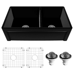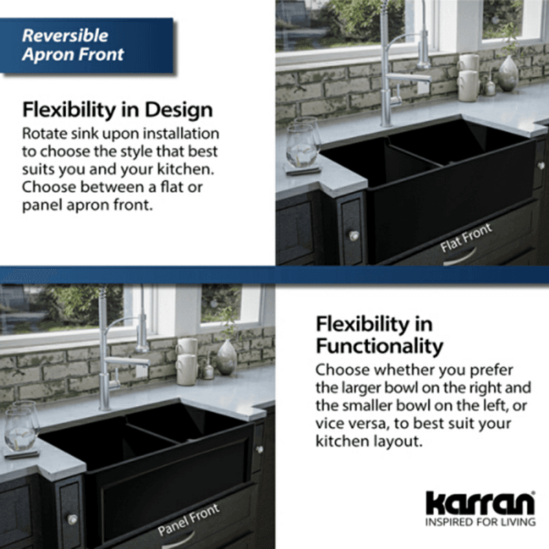 Designed for those who appreciate bold, modern aesthetics, the Karran FCP33DBMB combines style and functionality in a 60/40 double bowl configuration. Handcrafted from high-density fireclay, this sink is fired at over 2000°F, making it resistant to heat, scratches, and stains. The sleek matte black finish offers a contemporary edge, while the reversible apron front allows for design flexibility. Perfect for any kitchen, this sink provides ample workspace for daily kitchen tasks with the added elegance of a striking matte finish. Features: Fireclay double bowl panel front farmhouse kitchen sink with reversible apron front in matte black 60/40 Double Bowl Configuration: Offers versatility with a larger bowl for washing and a smaller bowl for prep tasks, making kitchen work more efficient Reversible Apron Front Design: Switch between a sleek flat front or a decorative panel to suit your personal style Durable Fireclay Construction: Fired at over 2000°F, ensuring the sink resists chips, cracks, and discoloration Heat, Scratch & Stain Resistant: The non-porous surface resists high heat, scratches, and everyday stains, keeping it looking pristine Modern Matte Black Finish: Adds a bold, contemporary touch to your kitchen, perfect for modern design styles Included Accessories: Comes with 2 bottom grids and 2 basket strainers for added protection and efficient drainage Drain Location: Centered in each bowl Warranty: Limited Lifetime Warranty