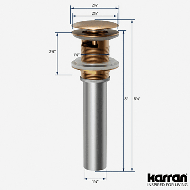 Constructed from durable brass, this stylish pop-up drain is compatible with all bathroom vanity sinks with an overflow. Choose from multiple distinctive finishes to match your bathroom faucet. All rubber gaskets are included for a simple and hassle-free installation. Features: Pop-Up vanity bowl drain with overflow in brushed copper Designed for bathroom vanity sinks with overflows Corrosion and rust-resistant finish All rubber gaskets included for simple installation Overall Height: 9" Diameter at top: 2-1/2" Diameter at bottom: 1-1/4" Flange diameter: 2-5/8"