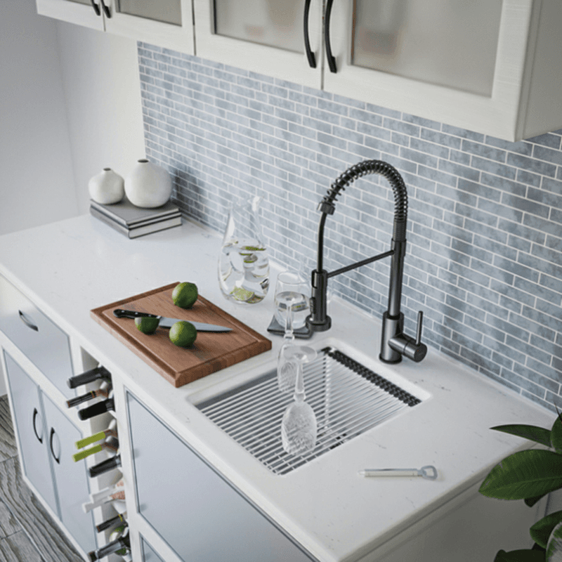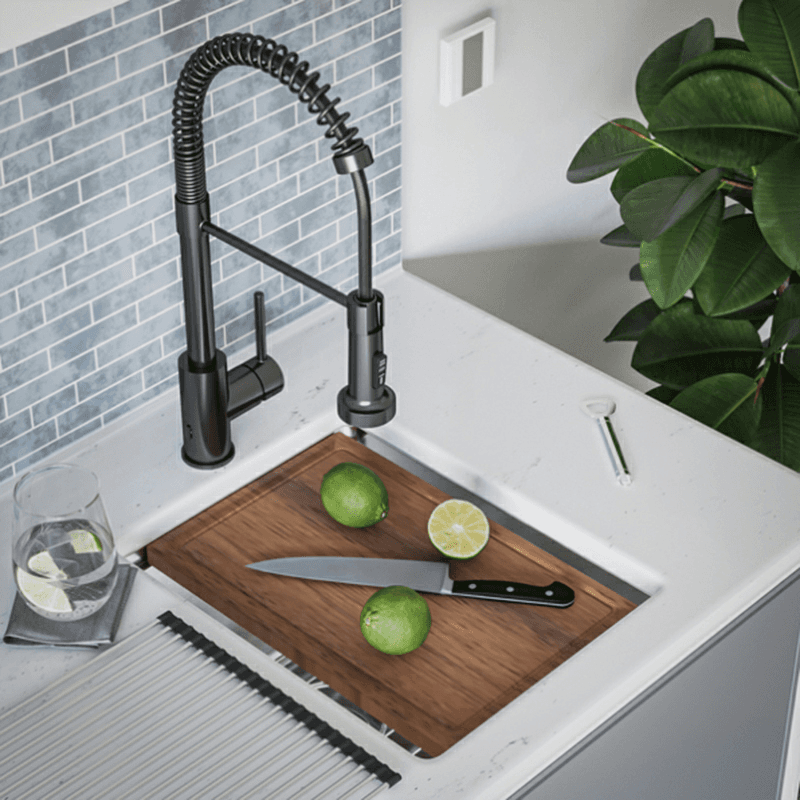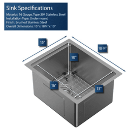 Enhance your kitchen′s efficiency with the undermount WS-31-PK1 Workstation Sink from Karran′s Elite collection, handcrafted to elevate your culinary workspace with its innovative smart ledge system. Inspired by professional kitchens, this compact 15" workstation sink empowers your bar, prep, or entertainment area with unparalleled functionality. Whether as a primary sink in a smaller kitchen or a versatile addition to larger spaces, its smart ledge system supports the Cutting Board and Drying Rack, maximizing utility without sacrificing counter space. Handmade from robust 16-gauge T304 stainless steel, this sink combines durability with a sleek satin finish, ensuring long-lasting performance and a modern aesthetic upgrade to any home kitchen. Features: Elite undermount 15" single bowl stainless steel workstation kitchen sink, stainless steel Integrated Smart Ledge System: The features an innovative smart ledge system that supports included accessories, including a custom-fit Cutting Board and Drying Rack, maximizing your workspace directly over the sink Compact Yet Powerful: Designed for efficiency in smaller spaces, this workstation sink packs the functionality of a full-sized sink into its compact 15" dimensions, making it perfect for modern kitchens and entertainment areas Handmade Craftsmanship: Each sink is meticulously handmade, ensuring quality and attention to detail that machine-pressed sinks cannot match, adding a unique touch to your kitchen Durable Construction: Crafted from premium 16-gauge T304 stainless steel, known for its exceptional durability and resistance to corrosion, ensuring long-lasting performance and a sleek appearance Sleek Satin Finish: The satin brushed finish not only enhances the sink′s aesthetics but also makes it easy to clean, maintaining its pristine look with minimal effort Sound Reduction Technology: Equipped with heavy-duty soundproof coating and thick rubber padding to minimize noise and vibrations, creating a quieter kitchen environment during use Included Accessories: Comes complete with a versatile Cutting Board and practical Drying Rack that utilize the smart ledge system, enhancing your kitchen′s efficiency and organization Drain Opening Size: Standard 3-1/2" Soundproofing: Heavy-duty soundproof coating and thick rubber padding Accessories Included: Cutting Board, Rolling Drying Rack, Basket Strainer, Bottom Grid cUPC (IAPMO) Certified Warranty: Limited Lifetime Warranty Transform your kitchen workflow with the WS-31-PK1 Workstation Sink, combining space-saving design with premium materials and functionality for a superior culinary experience.