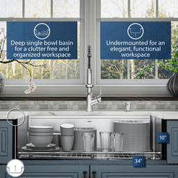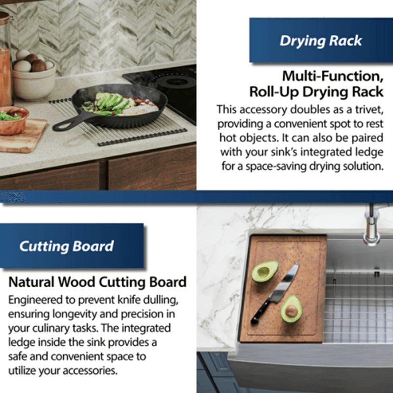 Elevate your kitchen with the workstation sink from Karran′s Elite Collection. Crafted from durable 16-gauge stainless steel, this sink combines functionality with elegant design. The deep apron front enhances both aesthetics and usability, providing ample space for all your kitchen tasks. Equipped with an integrated ledge system, the sink maximizes counter space and facilitates easy accessory integration, making meal prep and cleanup effortless. With a resilient satin brushed finish and sleek tight-radius corners, this sink offers not only style but also easy maintenance. Upgrade your kitchen with the Elite Collectionworkstation sink, where form meets function seamlessly. Features: Elite apron front farmhouse 30" single bowl stainless steel workstation sink in stainless steel Durable Stainless Steel Construction: Built to last with 16-gauge stainless steel, ensuring longevity and resistance to corrosion Deep Apron Front Design: Features a 10" apron front for a classic and functional appearance in your kitchen Integrated Ledge System: Enhances efficiency by allowing accessories to slide across the sink, optimizing workspace during meal preparation Satin Brushed Finish: Provides an easy-to-clean surface with a timeless aesthetic that complements any kitchen decor Tight-Radius Corners: Modern corners make cleaning and maintenance simple, adding to the sink′s sleek design Included Accessories: Comes with a Bottom Grid, Basket Strainer, Cutting Board, and Drying Rack to enhance your kitchen′s efficiency and organization Inside Bowl Dimensions: 34" x 16" x 10" Drain Opening Size: Standard 3-1/2" Weight: Approximately 48 lbs cUPC (IAPMO) Certified, Meets ASME A112.19.3/CSA B45.4, NSF/ANSI 61, NSF/ANSI 372 USA