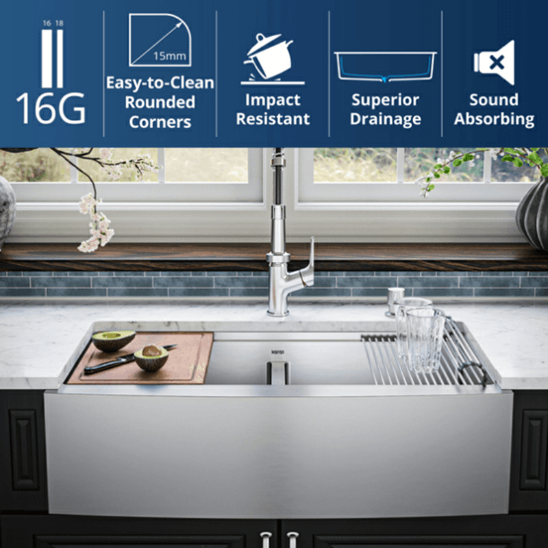 Elevate your kitchen with the Karran Elite farmhouse workstation sink, crafted for optimal functionality and enduring style. Handcrafted from durable 16-gauge stainless steel, this double bowl sink combines practicality with a sleek design, perfect for modern kitchens. The deep apron front enhances its classic farmhouse appeal while providing ample space for daily kitchen tasks. Featuring an integrated smart ledge system, this sink maximizes countertop space by allowing accessories to slide across seamlessly, from meal prep to cleanup. The satin brushed finish and tight-radius corners ensure easy maintenance and a timeless look that complements any décor. Features: Elite wsa-48-pk1 apron front farmhouse 36" double bowl stainless steel workstation sink in stainless steel Double Bowl Configuration: Offers two spacious bowls with interior dimensions of 16.37" x 16" x 10" each, providing versatility for multitasking and efficient workflow Premium Stainless Steel Construction: Handcrafted from 16-gauge T304 stainless steel for superior durability, resistance to corrosion, and lasting performance Integrated Smart Ledge System: Maximizes functionality by supporting accessories directly over the sink, optimizing workspace and organization Satin Brushed Finish: Provides a smooth, easy-to-clean surface that maintains its aesthetic appeal over time with minimal maintenance Soundproofing Technology: Equipped with heavy-duty soundproof coating and thick rubber padding to reduce noise and vibration for a quieter kitchen experience Included Accessories: Comes with a Bottom Grid, Basket Strainer, Cutting Board, and Drying Rack to enhance your kitchen′s efficiency and organization Drain Opening Size: Standard 3-1/2" cUPC (IAPMO) Certified, Meets ASME A112.19.3/CSA B45.4, NSF/ANSI 61, NSF/ANSI 372 USA Transform your kitchen with the functional elegance of the Karran Elite WSA-48-PK1 double bowl farmhouse workstation sink, designed to enhance your culinary experience and kitchen aesthetics