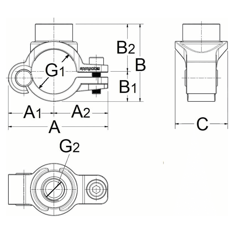 Features: 110mm x 1" FNPT Saddle Branch for Compressed Air Weight: 1.3 lb Max Working Pressure 435 PSI (30 bar) Dimension of A Size: 179.5mm Dimension of A1 Size: 81mm Dimension of A2 Size: 98mm Dimension of B Size: 150mm Dimension of B1 Size: 65mm Dimension of B2 Size: 65mm Dimension of C Size: 66mm