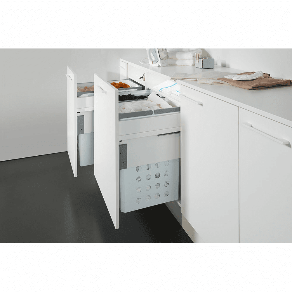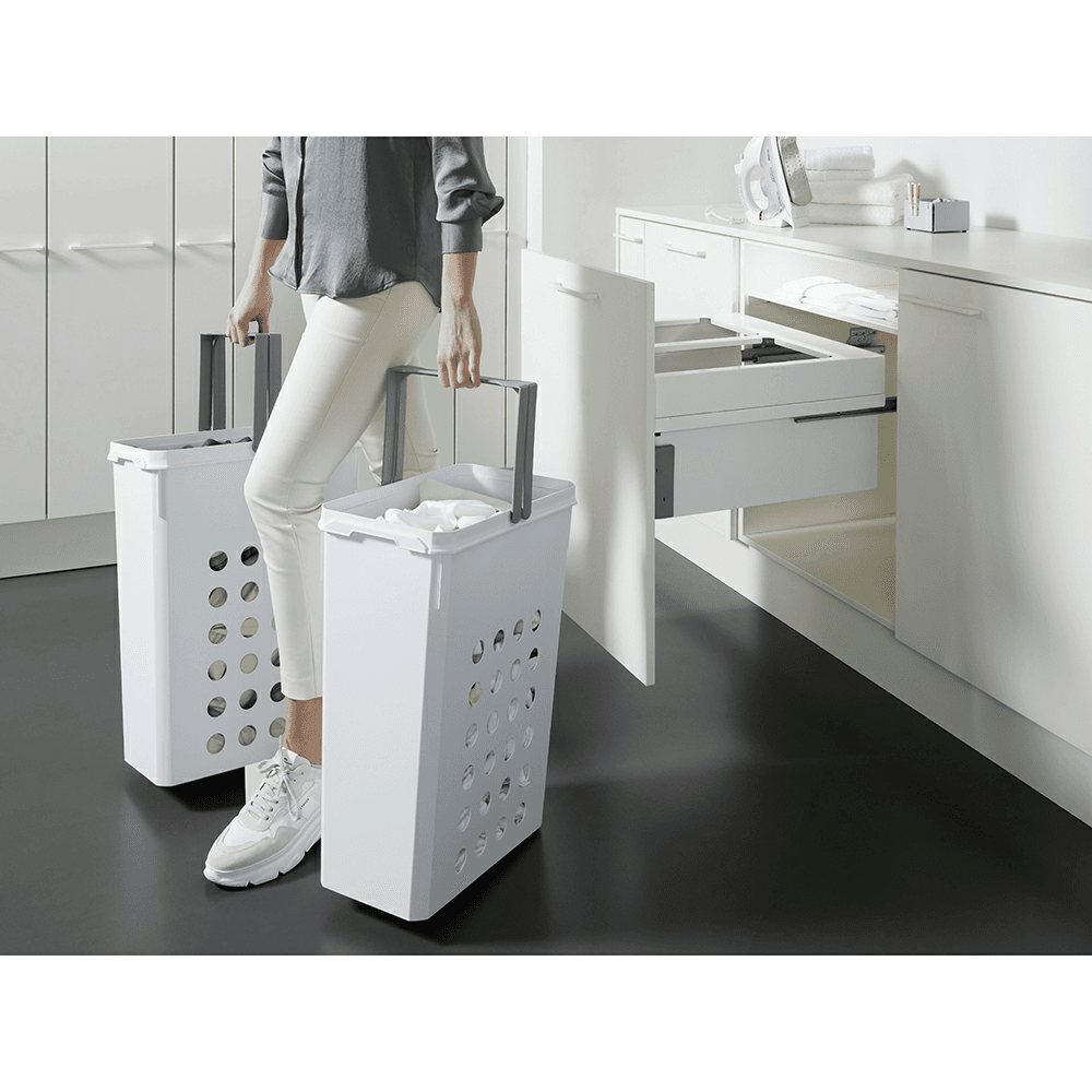 VS WASH® is the fresh solution for dirty laundry. Sorting,storing and transporting your laundry has never been simpler. Or more discreet. Discreetly add items to your laundry basket, which can be perfectly integrated into your cupboard or utility room. The function and style of the VS WASH® is based on our popular waste separation system VS ENVI® Space XX. The result is recycling and laundry solutions with the same look. The new laundry bins come in a unique variety of styles, all of which are perforated for optimum air circulation. The holes are rounded on both the outside and the inside of the containers. This innovative idea helps to protect the laundry. A handle makes it easier than ever before to carry laundry to the washing machine – even if you take two laundry bins at once.