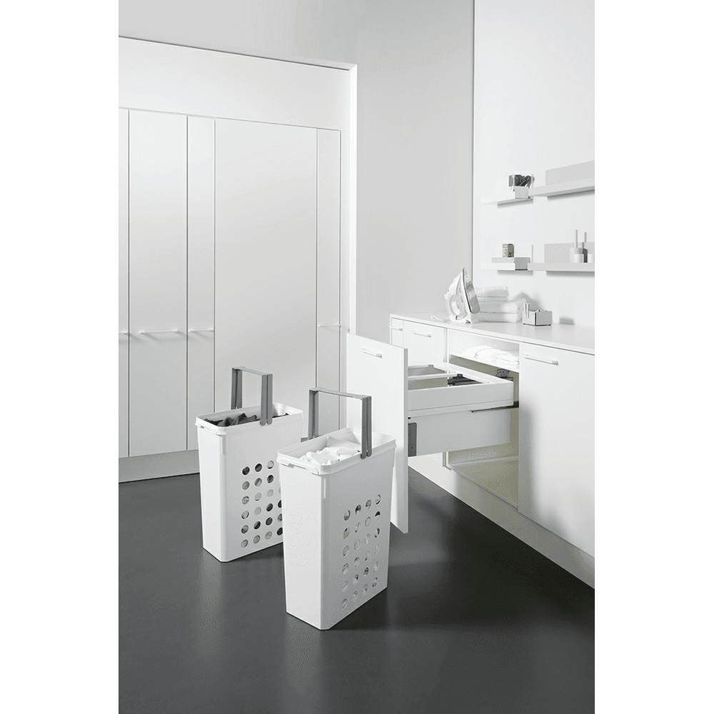 VS WASH® is the fresh solution for dirty laundry. Sorting,storing and transporting your laundry has never been simpler. Or more discreet. Discreetly add items to your laundry basket, which can be perfectly integrated into your cupboard or utility room. The function and style of the VS WASH® is based on our popular waste separation system VS ENVI® Space XX. The result is recycling and laundry solutions with the same look. The new laundry bins come in a unique variety of styles, all of which are perforated for optimum air circulation. The holes are rounded on both the outside and the inside of the containers. This innovative idea helps to protect the laundry. A handle makes it easier than ever before to carry laundry to the washing machine – even if you take two laundry bins at once.