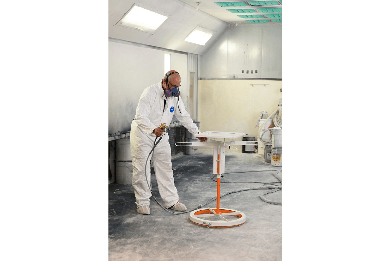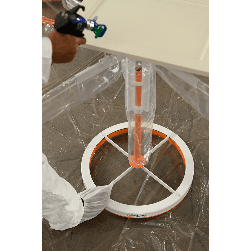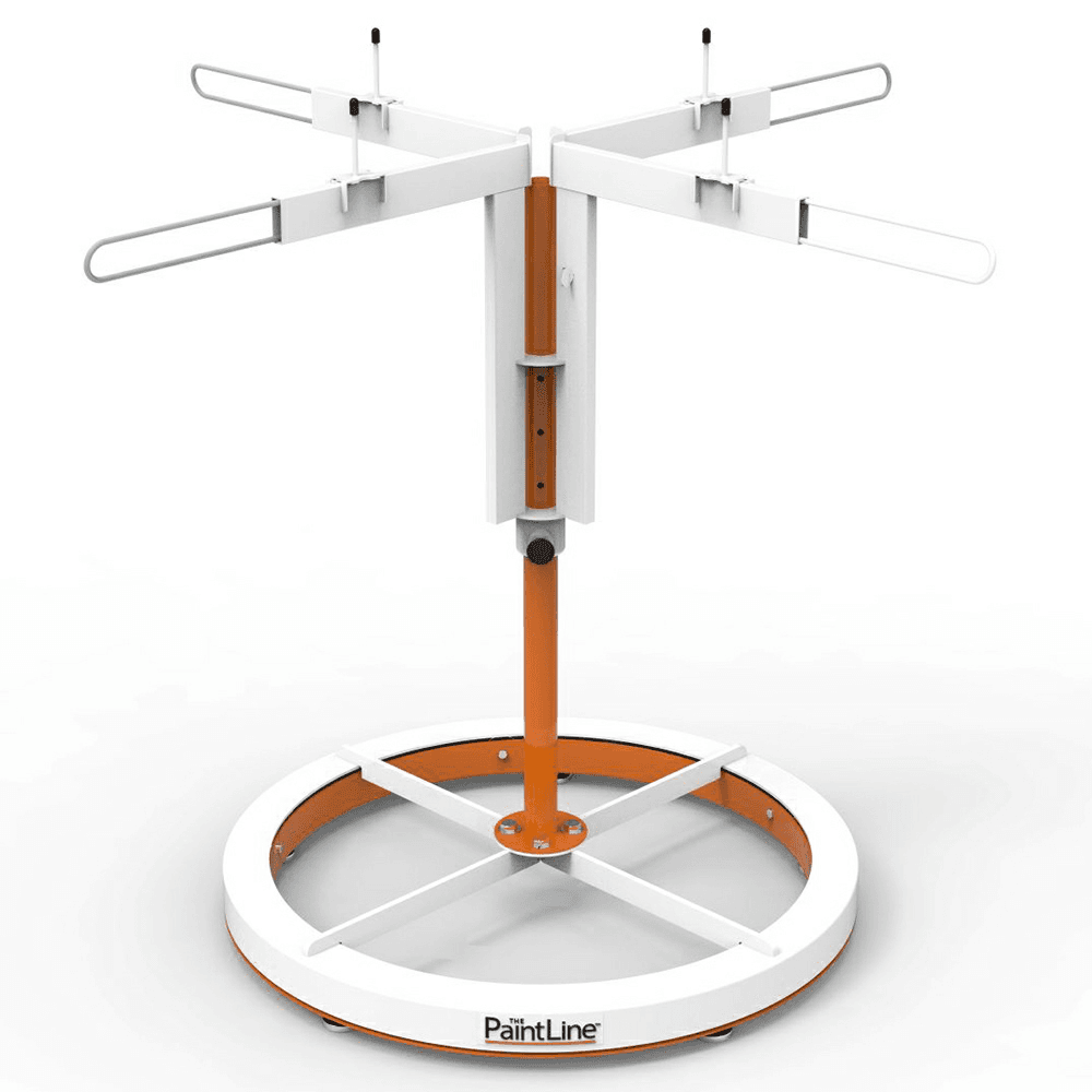Features: Hands-free rotation with the 360-degree foot operated turntable to spray all edges Height quickly adjusts from 32” to 38” with spring-loaded knobs Adjustable paint pyramids and retractable arms for handling a wide range of sizes Easy, tool-free assembly Accomodates up to 60 lb. Powder-coated steel base, vertical pole, and spinner assembly Included small MDF surface easily swapped out with the adjustable arms to provide a stable and solid platform for smaller parts Application: Paint Spraying Included Steel base, vertical pole and spinner assembly, magnetic spikes, MDF Table Top